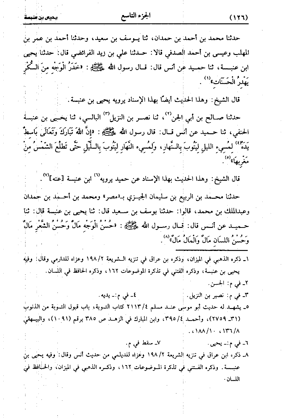 حَدَّثَنَا يَحْيى بن مُحَمد ابن صاعد، حَدَّثَنا يُوسُفُ بْنُ سَعِيد بْنِ مسلم، حَدَّثَنا يَحْيى بن عنبسة، حَدَّثَنا حُمَيْدٍ الطَّوِيلِ، عَن أَنَس، قَال: قَال رَسُولُ اللَّهِ صَلَّى اللَّهُ عَلَيْهِ وَسَلَّمَ: لاَ يَتَوَضَّأْ أَحَدُكُمْ فِي مَوْضِعِ اسْتِنْجَائِهِ فَإِنَّ الْوُضُوءَ يُوضَعُ مَعَ الْحَسَنَاتِ فِي الْمِيزَانِ يَوْمَ الْقِيَامَةِ.