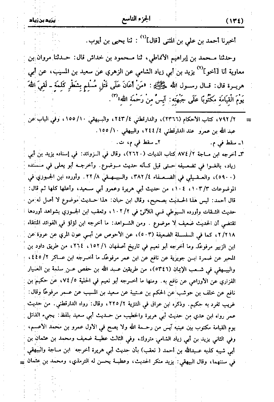 أَخْبَرنا أَحْمَدُ بْنُ عَلِيِّ بْنِ المثنى، قَال: حَدَّثَنا يَحْيى بن أيوب (ح) وَحَدَّثَنَا مُحَمد بْنُ إِبْرَاهِيمَ الأَنْمَاطِيُّ، حَدَّثَنا محمود بن خداش، قالا: حَدَّثَنا مَرْوَانُ بْنُ مُعَاوِيَةَ أَنَا أَخُو يَزِيدَ بْنِ أَبِي زِيَادٍ الشَّامِيُّ، عنِ الزُّهْريّ عَنْ سَعِيد بْنِ المُسَيَّب، عَن أَبِي هُرَيْرَةَ، قَال: قَال رَسُولُ اللَّهِ صَلَّى اللَّهُ عَلَيْهِ وَسَلَّمَ مَنْ أَعَانَ عَلَى قَتْلِ مُسْلِمٍ بِشَطْرِ كَلِمَةٍ لَقِيَ اللَّهَ يَوْمَ الْقِيَامَةِ مَكْتُوبًا عَلَى جَبْهَتِهِ آيِسٌ مِنْ رَحْمَةِ الله