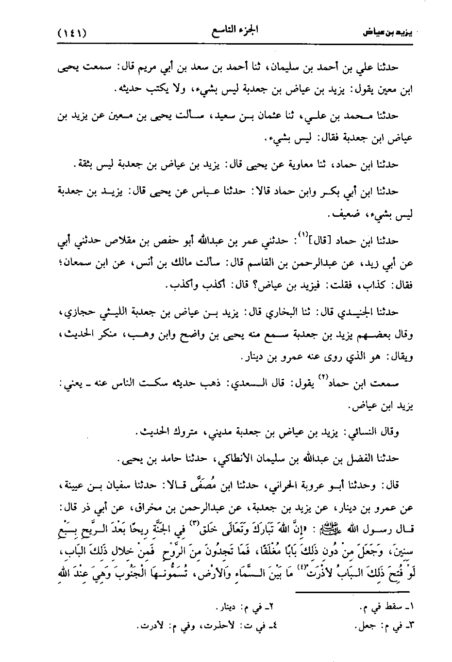 ، حَدَّثَنا عَلِيُّ بْنُ أَحْمَدَ بْنِ سليمان، حَدَّثَنا أحمد بن سعد بْنِ أَبِي مَرْيَمَ، قَالَ: سَمِعْتُ يَحْيى بن مَعِين يقول يزيد بن عياض بن جعدبة ليس بشَيْءٍ، ولاَ يكتب حديثه.