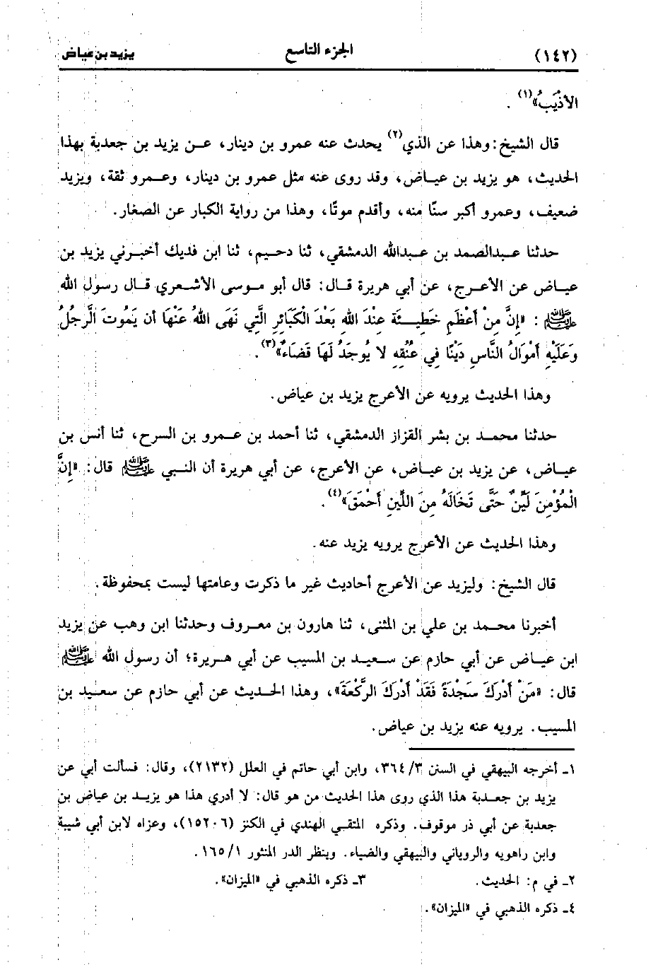 حَدَّثَنَا عَبد الصَّمَدِ بْنُ عَبد الله الدمشقي، حَدَّثَنا دحيم، حَدَّثَنا ابْنُ فُدَيْكٍ أَخْبَرَنِي يَزِيدُ بْنُ عِيَاضٍ عَنِ الأَعْرَجِ، عَن أَبِي هُرَيْرَةَ، قَال: قَال أَبُو مُوسَى الأَشْعَرِيِّ قَال رَسُول اللهِ صَلَّى اللَّهُ عَلَيهِ وَسلَّمَ: إِنَّ مَنْ أَعْظَمِ خَطِيئَةٍ عِنْدَ اللَّهِ بَعْدَ الْكَبَائِرِ الَّتِي نَهَى اللَّهُ عَنْهَا أَنْ يَمُوتَ الرَّجُلُ وَعَلَيْهِ أَمْوَالُ النَّاسِ دَيْنًا فِي عُنُقِهِ لا يُوجَدُ لَهَا قَضَاءٌ.