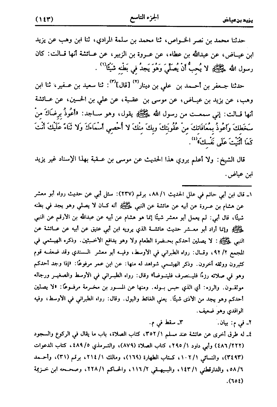 ، حَدَّثَنا مُحَمد بْنُ نَصْرٍ الْخَوَّاصُ، حَدَّثَنا مُحَمد بْنُ سَلَمَةَ الْمُرَادِيُّ، حَدَّثَنا ابْنُ وَهب، عَنْ يَزِيدَ بْنِ عِيَاضٍ عَنْ عَبد اللَّهِ بْنِ عَطاء، عَن عُرْوَةَ بْنِ الزُّبَيْرِ عَنْ عَائِشَةَ أَنَّهَا قَالَتْ كَانَ رَسُولِ اللَّهِ صَلَّى اللَّهُ عَلَيْهِ وَسَلَّمَ: لاَ يُحِبُّ أَنْ يُصَلِّيَ، وَهو يَجِدُ فِي بَطْنِهِ شَيئًا.