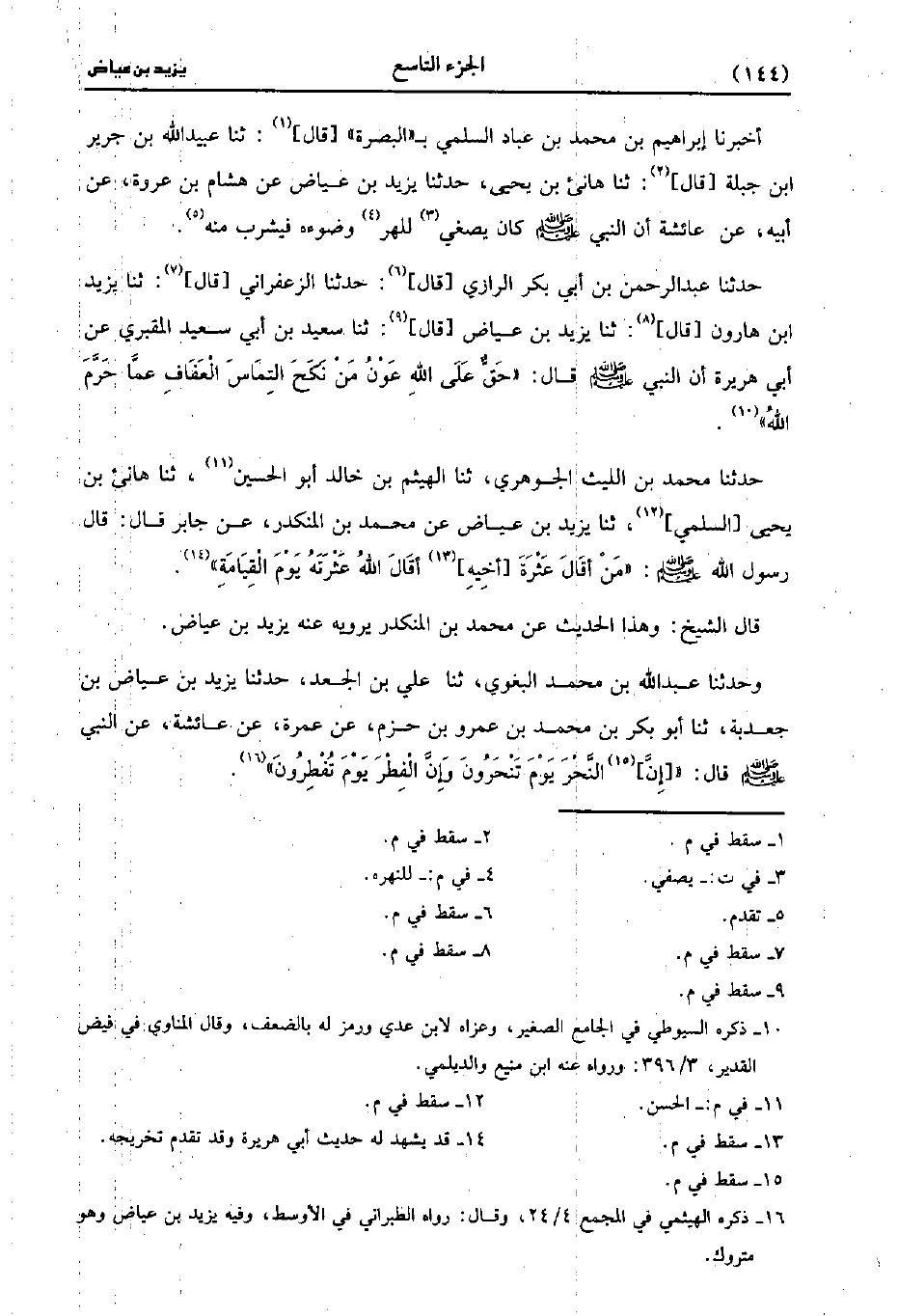 قَالَ الشَّيْخُ: وَهَذَا الْحَدِيثُ عَنْ مُحَمد بْنِ الْمُنْكَدِرِ يَرْوِيهِ عَنْهُ يَزِيدُ بْنُ عِيَاضٍ (ح) وَحَدَّثَنَا عَبد اللَّهِ بْنُ مُحَمد البغوي، حَدَّثَنا عَلِيُّ بْنُ الْجَعْدِ، حَدَّثَنا يزيد بن عياض بن جعدبة، حَدَّثَنا أَبُو بَكْرِ بْنُ مُحَمد بْنِ عَمْرو بْنِ حَزْمٍ عَنْ عَمْرَةَ عَنْ عَائشة، عَن النَّبِيِّ صَلَّى اللَّهُ عَلَيهِ وَسلَّمَ، قَال: إِنَّ النَّحْرَ يَوْمَ تَنْحَرُونَ، وَإِنَّ الْفِطْرَ يوم تفطرون