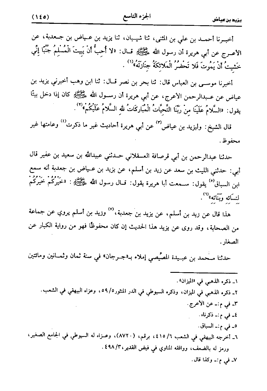 حَدَّثَنَا عَبد الرَّحْمَنِ بْنُ أَبِي قُرْصَافَةَ الْعَسْقَلانِيُّ، حَدَّثني عُبَيد اللَّهِ بْنُ سَعِيد بْنِ عُفَيْرٍ قَالَ أَبِي، حَدَّثني اللَّيْثُ بْنُ سَعْدٍ عَنْ زَيْدِ بْنِ أَسْلَمَ، عَنْ يَزِيدَ بْنِ عِيَاضِ بْنِ جُعْدُبَةَ أَنَّهُ سمع بن السياف يَقُولُ: سَمعتُ أَبَا هُرَيْرَةَ يَقُولُ: قَال رَسُول اللهِ صَلَّى اللَّهُ عَلَيهِ وَسلَّمَ خَيْرُكُمْ خَيْرُكُمْ لِنِسَائِهِ وَبَنَاتِهِ.