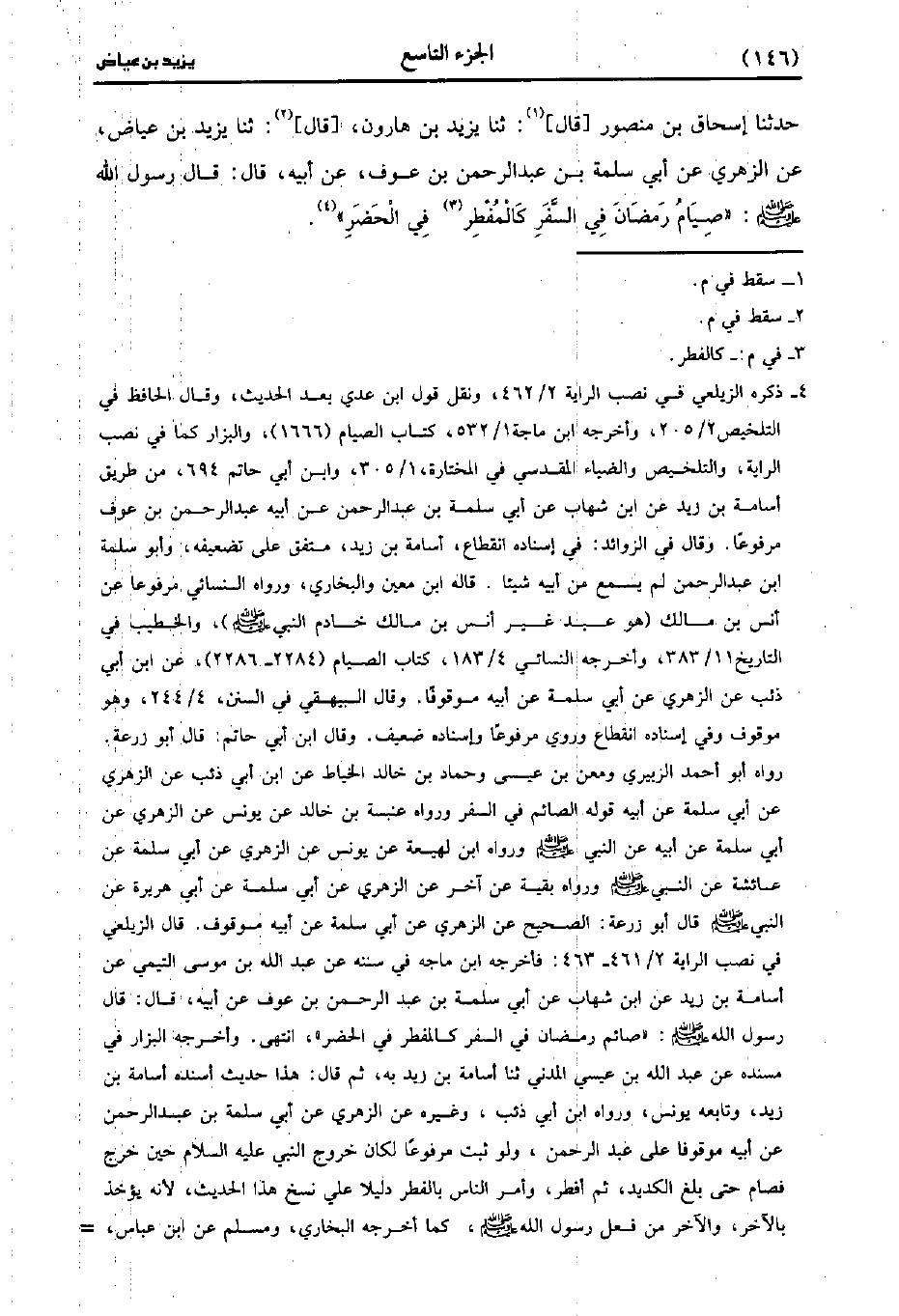 ، حَدَّثَنا إِسْحَاقُ بْنُ مَنْصُورٍ، قَال: حَدَّثَنا يَزِيدُ بْنُ هَارُونَ، قَال: حَدَّثَنا يَزِيدُ بْنُ عِيَاضٍ، عنِ الزُّهْريّ، عَن أَبِي سَلَمَةَ بْنِ عَبد الرَّحْمَنِ بْنِ عَوْفٍ، عَنْ أَبِيهِ، قَال: قَال رَسُولُ اللَّهِ صَلَّى اللَّهُ عَلَيْهِ وَسَلَّمَ صِيَامُ رَمَضَانَ فِي السَّفَرِ كَالْمُفْطِرِ فِي الْحَضَرِ