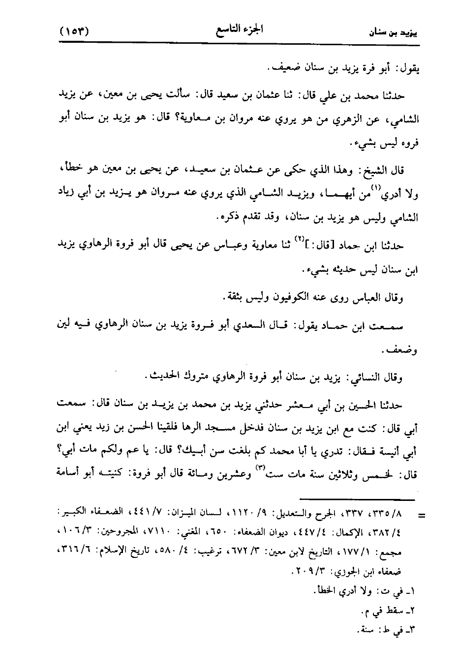 قال الشيخ: وهذا الذي حكي عن عثمان بن سَعِيد، عَن يَحْيى بن مَعِين هو خطأ، ولاَ أدري من أيهما ويزيد الشامي الذي يروى عنه مروان هو يزيد بن أبي زياد الشامي وليس هو يزيد بن سنان وقد تقدم ذكره.