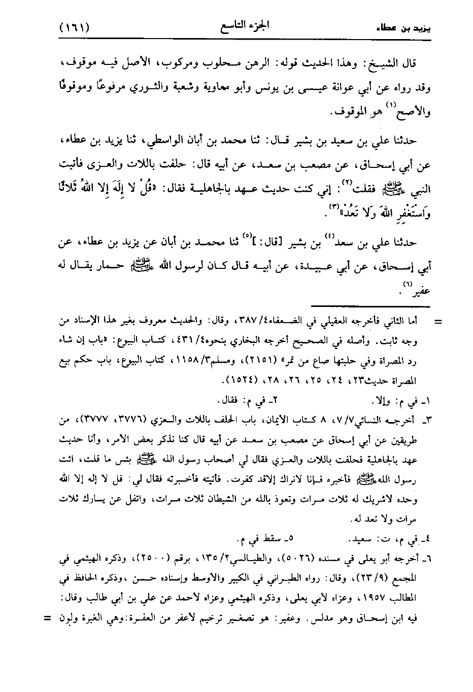 حَدَّثَنَا عَلِيُّ بْنُ سَعِيد بْنِ بَشِيرٍ، قَال: حَدَّثَنا مُحَمد بن أَبَان الواسطي، حَدَّثَنا يَزِيدُ بْنُ عَطَاءٍ، عَن أَبِي إِسْحَاقَ عَنْ مُصْعَبِ بْنِ سَعْدٍ، عَنْ أَبِيهِ قَالَ حَلَفْتُ بِاللاتِ وَالْعُزَّى فَأَتَيْتُ النَّبِيَّ صَلَّى اللَّهُ عَلَيهِ وَسلَّمَ فَقُلْتُ إِنِّي كُنْتُ حَدِيثَ عَهْدٍ بِالْجَاهِلِيَّةِ فَقَالَ قُلْ لا إِلَهَ إِلا اللَّهُ ثَلاثًا وَاسْتَغْفِرِ اللَّهَ، ولاَ تَعُدْ.