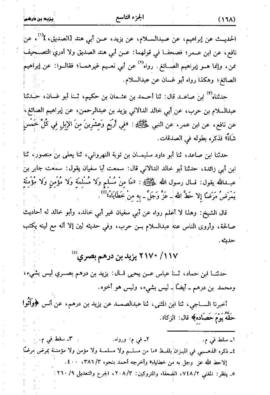 حَدَّثَنَاهُ ابْنُ صاعد، قَال: حَدَّثَنا أَحْمَدُ بْنُ عُثْمَانَ بْنُ حكيم، حَدَّثَنا أَبُو غَسَّانَ، حَدَّثَنا عَبد السَّلامِ بْنُ حَرْبٍ، عَن أَبِي خَالِدٍ الدَّالانِيِّ يَزِيدَ بْنِ عَبد الرَّحْمَنِ عَنْ إِبْرَاهِيمَ الصَّائِغِ عَنْ نَافِعٍ، عنِ ابْنِ عُمَر عَنِ النَّبِيِّ صَلَّى اللَّهُ عَلَيهِ وَسلَّمَ فِي أَرْبَعٍ وَعِشْرِينَ مِنَ الإِبِلِ فِي كُلِّ خَمْسٍ شَاةٌ فَذَكَرَهُ بِطُولِهِ فِي الصَّدَقَاتِ.