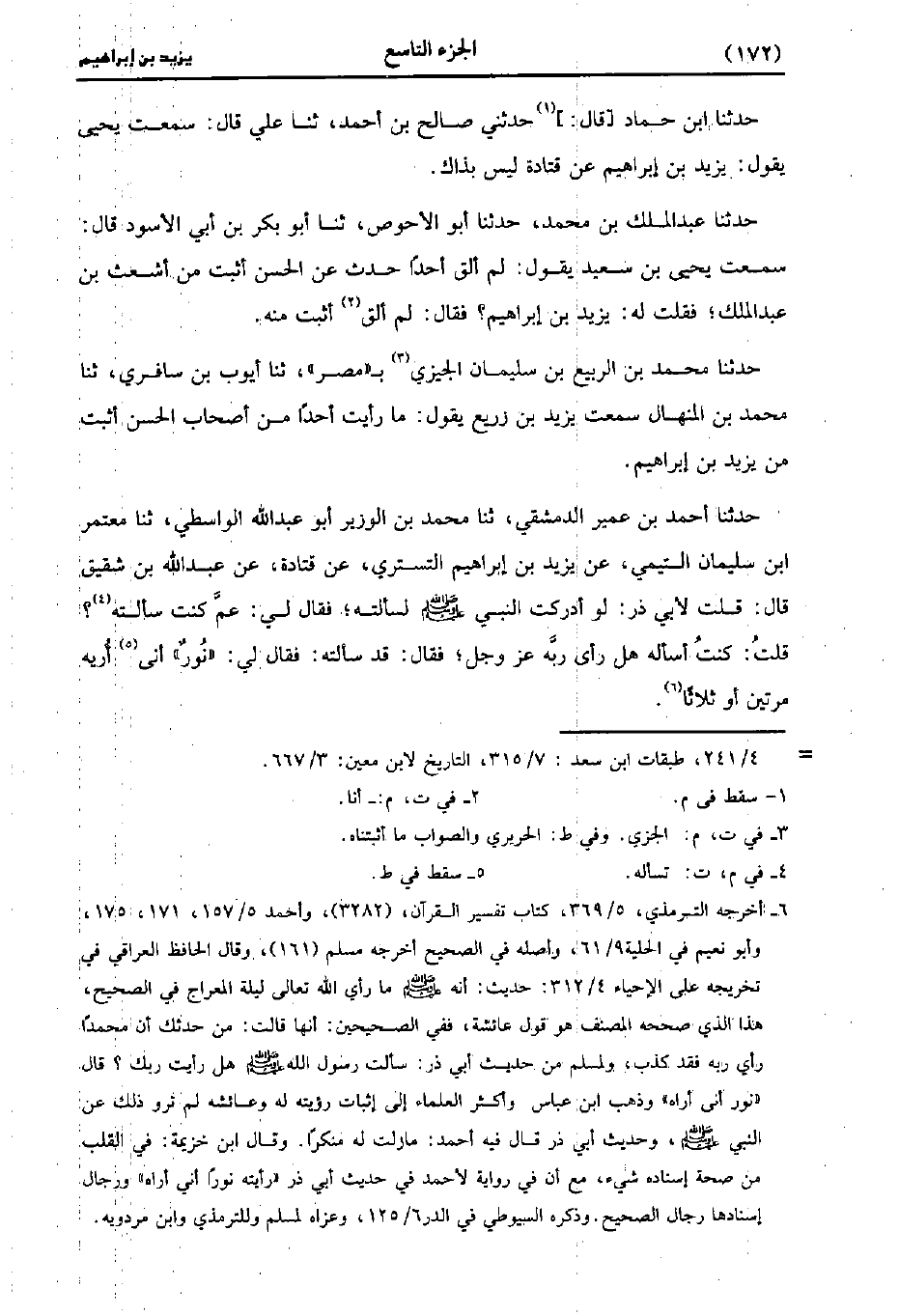 حَدَّثَنَا أحمد بن عُمَير الدمشقي، حَدَّثَنا مُحَمد بْنُ الْوَزِيرِ أَبُو عَبد الله الواسطي، حَدَّثَنا مُعْتَمِرُ بْنُ سُلَيْمَانَ التَّيْمِيُّ عَنْ يَزِيدَ بْنِ إِبْرَاهِيمَ التُّسْتَرِيِّ، عَن قَتادَة عَنْ عَبد اللَّهِ بْنِ شَقِيقٍ، قالَ: قُلتُ لأَبِي ذَرٍّ لَوْ أَدْرَكْتُ النَّبِيَّ صَلَّى اللَّهُ عَلَيهِ وَسلَّمَ لَسَأَلْتُهُ فَقَالَ لِي عَمَّ كُنْتَ سَأَلْتَهُ قُلْتُ كُنْتُ أَسْأَلُهُ هَلْ رَأَى رَبَّهُ عَزَّ وَجَلَّ فَقَالَ قَدْ سَأَلْتُهُ فَقَالَ لي نور اريه مرتين أو ثلاثا