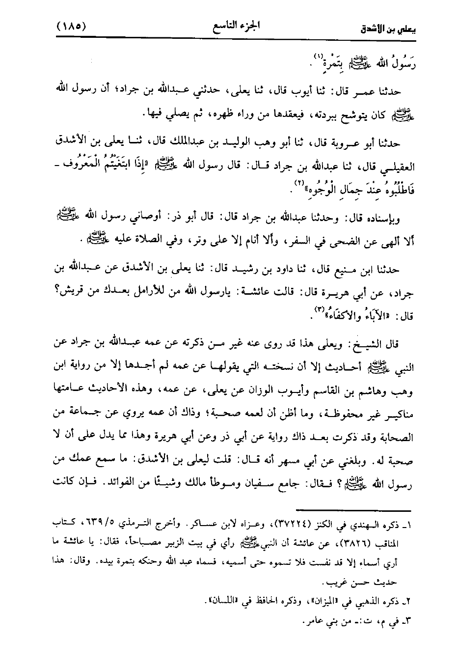 قَالَ الشَّيْخُ: وَيَعْلَى هَذَا قَدْ رُوِيَ عَنْهُ غَيْرَ مَا ذَكَرْتُهُ، عَن عَمِّه عَبد الله بن جراد عن النبي صَلَّى اللَّهُ عَلَيهِ وَسلَّمَ أَحَادِيثَ إِلا أَنَّ نُسْخَتَهُ يَقُولُهَا، عَن عَمِّه لَمْ أَجِدْهَا إِلا مِنْ رِوَايَةِ بْنِ وَهْبٍ وَهَاشِمِ بْنِ الْقَاسِمِ وَأَيُّوبَ الْوَزَّانِ عَنْ يَعْلَى، عَن عَمِّه وَهَذِهِ الأَحَادِيثُ عَامَّتُهَا مَنَاكِيرُ غَيْرُ مَحْفُوظَةٍ وَمَا أَظُنُّ أَنَّ لِعَمِّهِ صُحْبَةً وَذَاكَ أَنَّ عَمَّهُ يَرْوِي عَنْ جَمَاعَةٍ مِنَ الصَّحَابَةِ وَقَدْ ذَكَرْتُ بَعْدَ ذَاكَ رِوَايَةً، عَن أَبِي ذَرٍّ وَعَنْ أَبِي هُرَيْرَةَ وَهَذَا مِمَّا يَدُلُّ عَلَى أَنْ لا صُحْبَةَ لَهُ وَبَلَغَنِي، عَن أَبِي مُسْهِرٍ أَنَّهُ، قالَ: قُلتُ لِيَعْلَى بْنِ الأَشْدَقِ مَا سَمِعَ عَمُّكَ مِنْ رَسُولِ اللَّهِ صَلَّى اللَّهُ عَلَيْهِ وَسَلَّمَ فَقَالَ جَامَعَ سُفْيَانَ وَمُوَطَّأَ مَالِكٍ وَشَيْئًا مِنَ الفوائد فان كانت