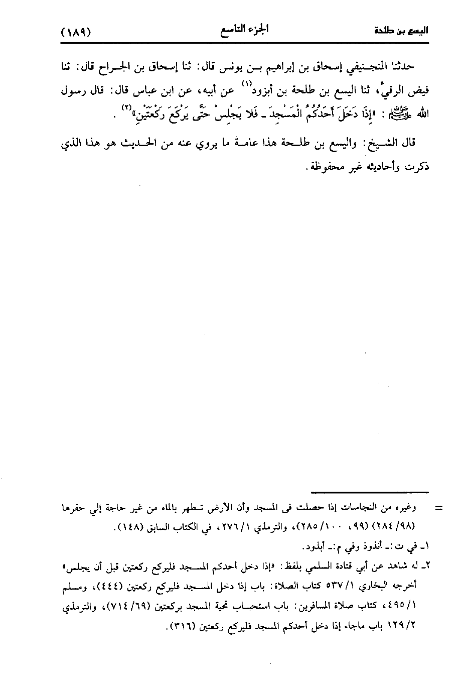 ، حَدَّثَنا الْمَنْجَنِيقِيُّ إِسْحَاقُ بْنُ إِبْرَاهِيمَ بن يُونُس، قَال: حَدَّثَنا إسحاق بن الجراح، قَال: حَدَّثَنا فيض الرقي، حَدَّثَنا الْيَسَعُ بْنُ طَلْحَةَ بْنِ أَبْزُوذٍ، عَنْ أَبِيهِ، عنِ ابْنِ عَبَّاسٍ، قَال: قَال رَسُولُ اللَّهِ صَلَّى اللَّهُ عَلَيْهِ وَسَلَّمَ إِذَا دَخَلَ أَحَدُكُمُ الْمَسْجِدَ فَلا يَجْلِسْ حَتَّى يَرْكَعَ رَكْعَتَيْنِ.