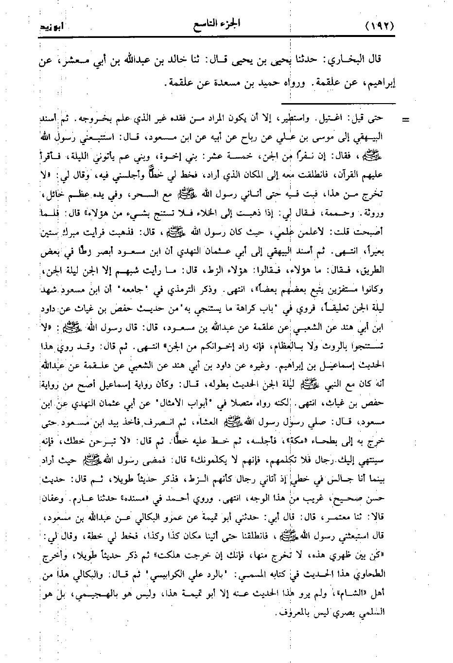 قال البُخارِيّ، حَدَّثَنا يَحْيى بن يَحْيى، قَال: حَدَّثَنا خَالِدُ بْنُ عَبد اللَّهِ، عَن أَبِي مَعْشَرٍ عَنْ إِبْرَاهِيمَ عَنْ علقمة ورواه حميد بن مسعدة عن علقمة