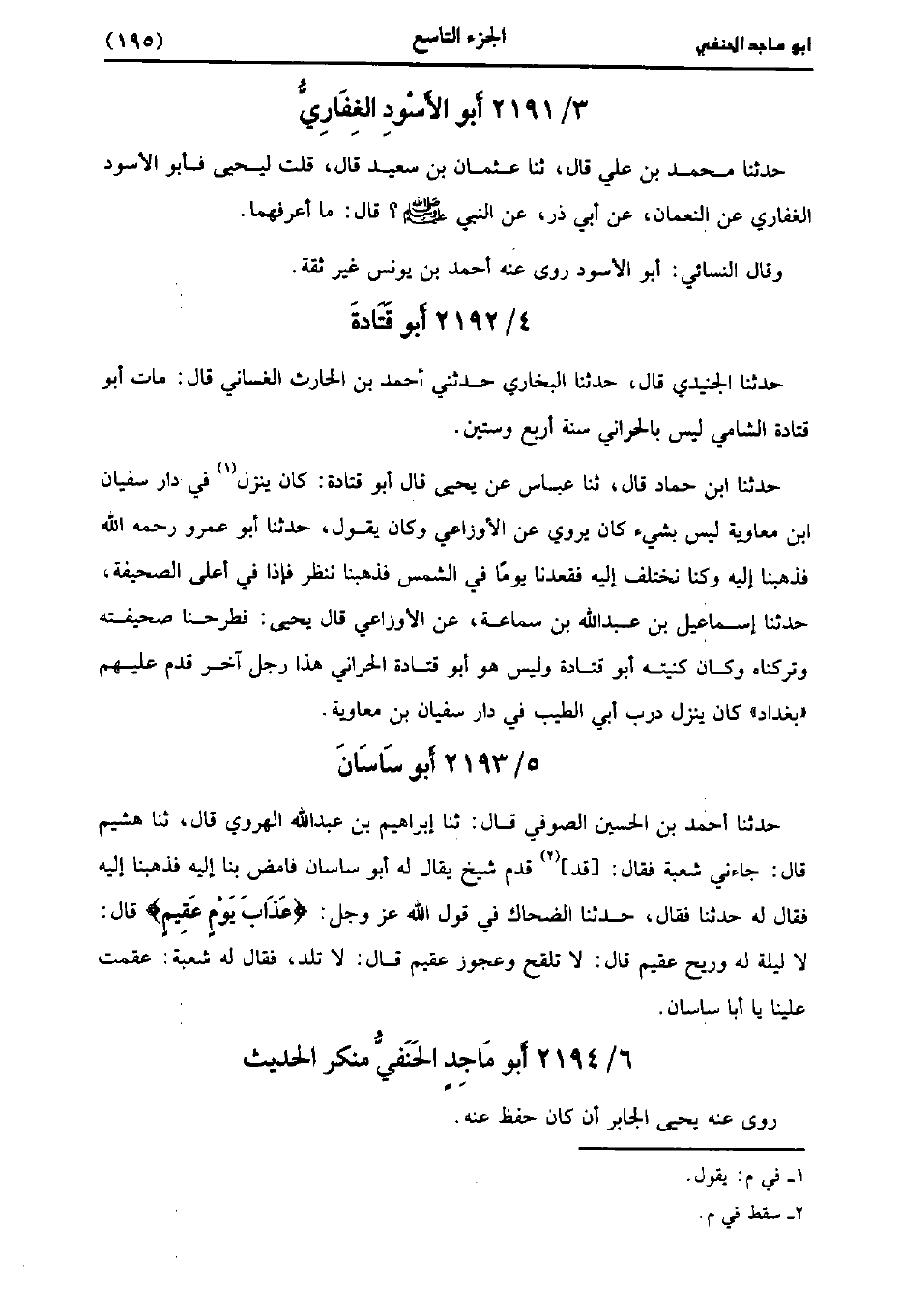 حَدَّثَنَا ابن حماد، قَال: حَدَّثَنا عباس، عَن يَحْيى، قال أبو قَتَادَةَ كان ينزل في دار سفيان بن معاوية ليس بشَيْءٍ كان يروي عن الأَوْزاعِيّ وكان يقول، حَدَّثَنا أبو عَمْرو رحمه الله فذهبنا إليه وكنا نختلف إليه فقعدنا يوما في الشمس فذهبنا ننظر فإذا في أعلى الصحيفة، حَدَّثَنا إسماعيل بن عَبد الله بن سماعه عن الأَوْزاعِيّ قال يَحْيى فطرحنا صحيفته وتركناه وكان كنيته أبو قَتَادَةَ وليس هو أبو قَتَادَةَ الحراني هذا رجل آخر قدم عليهم بغداد كان ينزل درب أبي الطيب في دار سفيان بن معاوية.
