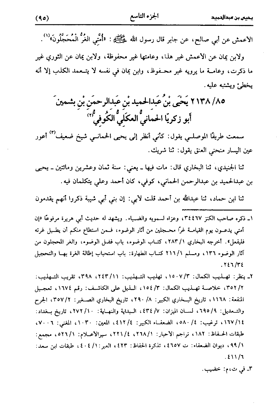 2138- يَحْيى بن عَبد الحميد بن عَبد الرحمن بن بشمين أبو زكريا الحماني العكلي الكوفي.