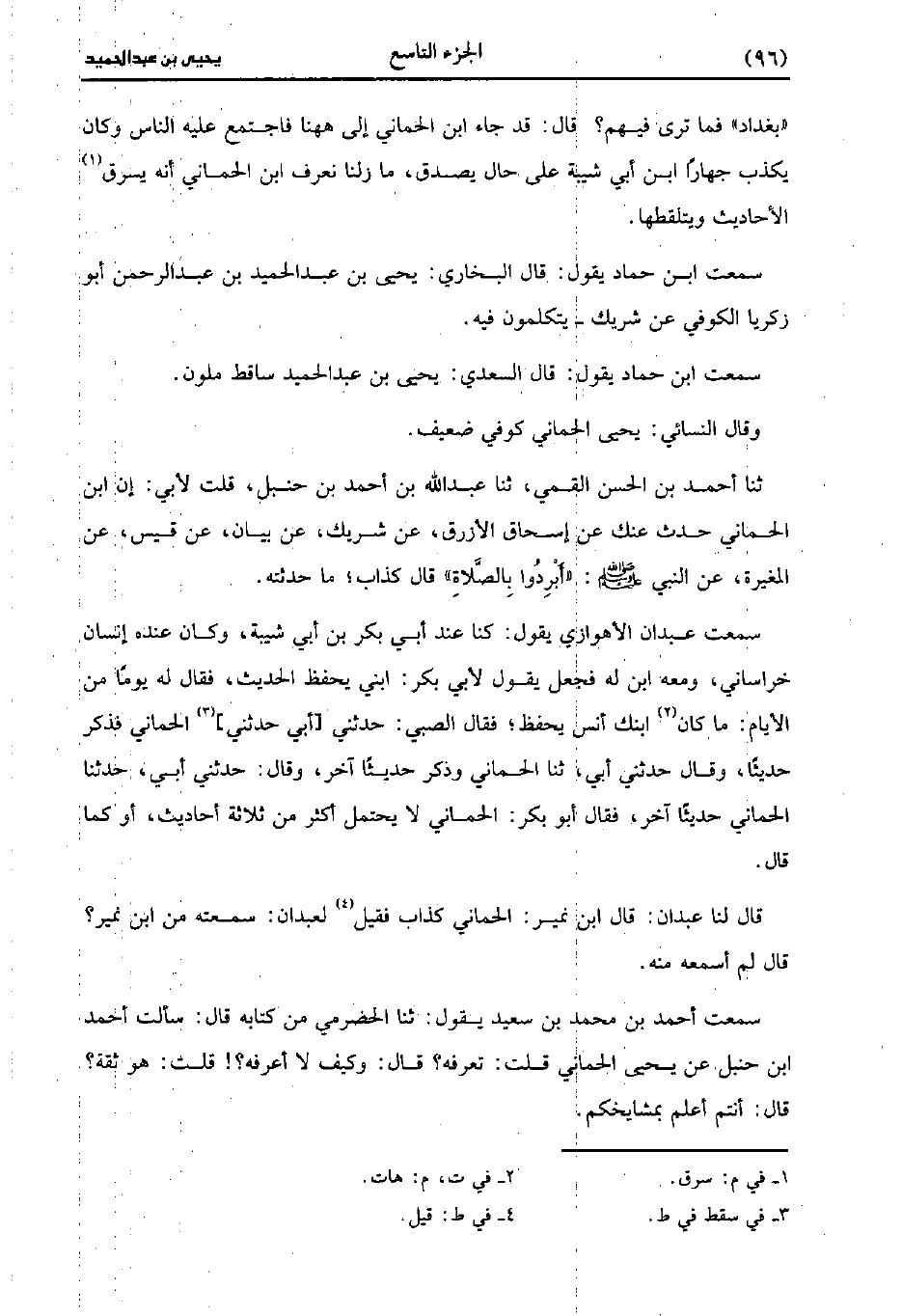 سَمِعْتُ أَحْمَدَ بْنَ مُحَمد بْنِ سَعِيد يقول، حَدَّثَنا الحضرمي من كتابه، قالَ: سَألتُ أحمد بن حنبل، عَن يَحْيى الحماني قلت تعرفه قال وكيف لا أعرفه قلت هو ثقة قال أنتم أعلم بمشايخكم