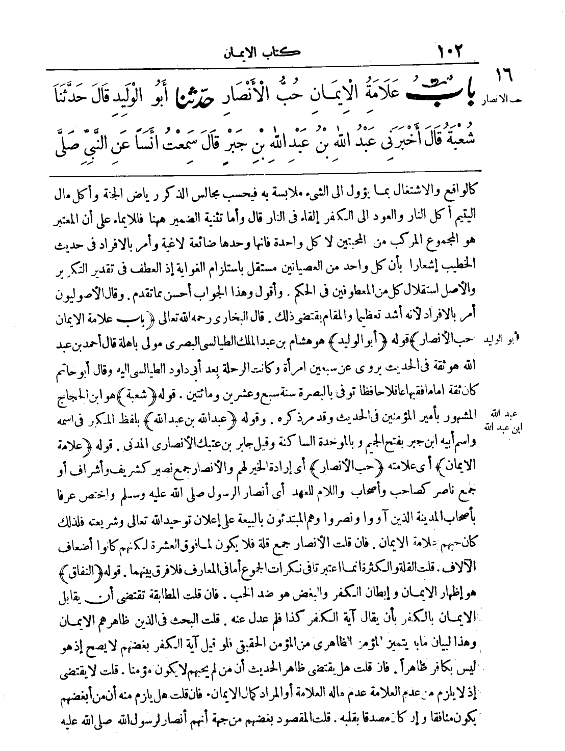 كالواقع والاشغتال بما يؤول الى الشئ ملابسة به فيحسب مجالس الذكر رياض الجنة وأكل مال اليتيم أكل النار والعود الى الكفر القاء فى النار قال وأما تئنية الضمير ههنا فالايماء على أن المعتبر هو المجموع المركب من المحبتين لا كل واحدة فانها ودها ضائعة لاغية وأمر بالافراد فى حديث الخطيب اشعارا بأن كل واحد من العصيانين مستقل باستلزام الغواية اذ العطف فى تقدير التكرير والأصل استقلال كل من المعطوفين فى الحكم. وأقول وهذا الجواب أحسن مما تقدم. وقال الأصوليون أمر بالافراد لانه أشد تعظيما والمقام يقتضى ذلك. قال البخارى رحمة الله تعالى (باب علامة الايمان حب الأنصار) قوله: (أبو الوليد) هو هشام بن عبد الملك الطيالسى البصرى مولى باهلة قال أحمد بن عبد الله هو ثقة فى الحديث يروى عبن سبعين امرأة وكانت الرحلة بعد أبى داود الطيالسى اليه وقال أبو حاتم كان ثقة اماما فقيها عاقلا حافظا توفى بالبصرة سنه سبع وعشرين ومائتين. قولة (شعبة) هو ابن الحجاج المشهور بأمير المؤمنين فى الحديث وقدم ذكره. وقوله: (عبدالله بن بدالله) بلفظ المكبر فى اسمه واسم أبيه ابن جبر بفتح الجيم وبالموحدة الساكنة وقبل جابر بن عتيك الأصارى المدنى. قوله: (علامة الايمان) أى علامته (حب الأنصار أى ارادة الخير لهم والأنصار جمع نصير كشريف وأشراف أو جمع ناصر كصاحب وأصاب والللام للعهد أى انصار الرسول صلى الله عليه وسلم واختص عرفا بأصحاب المدينة الذين اووا ونصروا وهم المبتدئون بالبيعة على اعلان توحيد الله تعالى وشريعته فلذلك كان حبهم علامة الايمان. فان قلت الأنار جمع قلة فلا يكون لما فوق العشرة لكنهم كانوا أضعاف الالاف. قلت القلة والكثرة انما اعتبرنا فى نكرات الجموع أما فى المعارف فلا فرق بينهما. قوله: (النفاق) هو اظهار الايمان وابطان الكفر والبغض هو ضد الحب. فان قلت المطابقة تقتضى أن يقابل الايمان بالكفر بأن يقال اية الكفر كذا فلم عدل عنه. قلت البحث فى الذين ظاهره الايمان وهذا لبيان مايتميز لمؤمن الظاهرى من المؤمن الحقيقى فلو قيل اية الكفر بغضهم لا يصح اذ هو ليش بكافر ظاهرا. فاذ قلت هل يقتضى ظاهر الحديث أن من لم يحبهم لا يكون مؤمنا. قلت لا يقتضى اذ لا يلزم من دم العلامة عدم ماله العلامة أو المراد كمال الايمان فان قلت هل يلزم منه أن من ابغضهم يكون منافقا واذا كان مصدقا بقلبه. قلت المقصود بغضهم من جهة أنهم أنصار لرسول الله صلى الله عليه