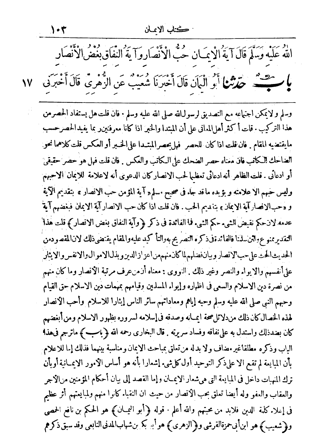 وسلم ولا يمكن اجتماعه مع التصديق لرسول الله صلى الله عليه وسلم. فان قلت هل يستفاد الحصر من هذا التركيب. قلت أكتر أمل المعانى على أن المبتدأ والخبر اذا كانا معرفتين وبما يفيد الحصر حسب ما يقتضيه المقام. فان قلت اذا كان للحصر فهل يحصر المبتدأ على الخبر أو العكس قلت كلاهما نحو الضاحك الكاثب فان معناه حصر الضحك على الكاتب والعكس. فان قلت فهل هو حصر حقيقى أو ادعائى. قلت الظاهر أنه ادعائى تعظما لحب الانصار كان الدعوى أنه لا علامة للايمان الا حبهم وليس حبهم الا علامته ويؤيده ماقد جاء فى صحيح مسلم (أية المؤمن حب الأنصار) بتقديم الاية و (حب الاصار أية الايمان) بتقديم الحب. فان قلت اذ كان حب الانصار أية الايمان فبغضهم أية عدمه لان حكم نقيض الشئ حكم الشئ فما الفائدة فى ذكر (وأية النفاق بض الانصار) قلت هذا التقدير ممنوع وأبن سلنا فالفائدة فى ذكره التصريح به والتأكيد عليه والمقام يقتضى ذلك لان المقصود من الحديث الحث على حب الانصار وبينات فضلهم لما كان منهم من اعزاز الدين وبذل الاموال والانفس والايئار على أنفسهم والايواء والنصر وغير ذلك. النووى: معناه أن من عرف مرتبة الأنصار وما كان منهم من نصرة دين الاسلام والسعى فى اظهاره وايواء المسلمين سائ الناس ايئارا للاسلام وأحب الأنصار لهذه الخصار كان ذلك من دلائل صحة ايمانه وصدقه فى اسلامة لسروره بظهور الاسلام ومن أبغضهم كان بعد ذلك واستدل به على نفاقه وفساد سريرته. قال البخارى رحمة الله (باب) ماترجم فى هذا الباب وذكره مطلقا غير مضاف ولا بدله من تعلق بمباحث الايمان ومناسبة بينهما فذل اما للاعلام بأن المبايعة لم تقع الا على ذكر التوحيد أول كل شئ اشعارا بأنه هو أساس الأمور الايمانية أو بأن ترك المنبات داخل فى المبايعه التى هى شعار الايمان واما القصد الى بيان أحكام المؤمنين من الأجر والعقاب والعفر وله أيضا تعلق بحب الأنصار من حيث ان النقباء كانوا منهم ولمبايعتهم أثر عظيم فى اعلاء كلمة الدين فلابد من محبتهم والله أعلم. قوله: (أبو اليمان) هو الحكم بن نافع الحمصى (شعيب) هو ابن أبى حمزة القرشى و (الزهرى) هو أبو بكر بن شهاب المدنى التابعى وقد سبق ذكرهم