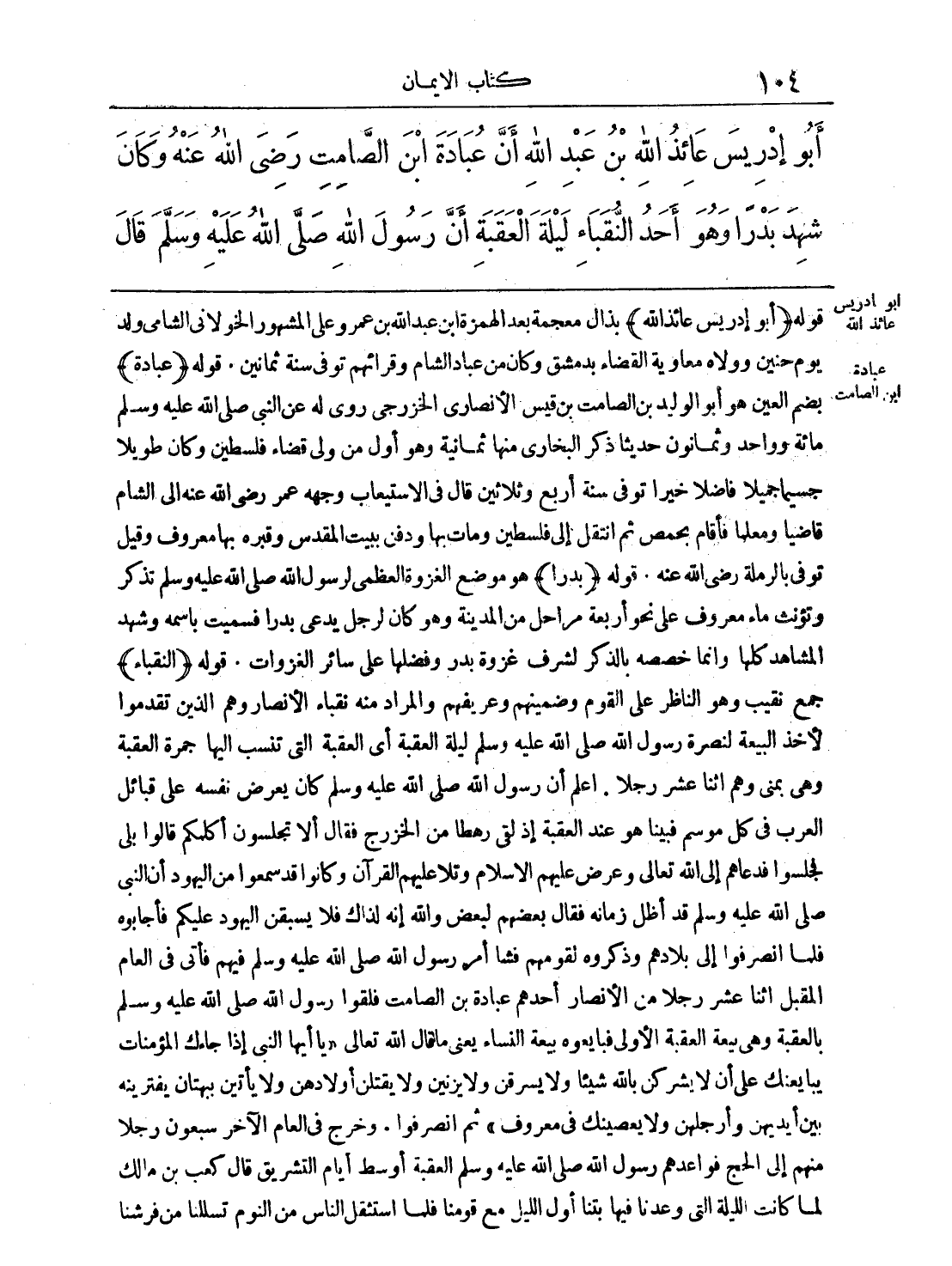 قوله: (أبو إدريس عائذ الله) بذال معجمة بعد الهمزة ابن عبدالله بن عمرو وعلى المشهور الخولانى الشامى ولد يوم حنين وولاه معاوية القضاء بدمشق وكان من عباد الشام وقرائهم توفى سنة ثمانين. قولة (عبادة) بضم العين هو أبو الوليد بن الصامت بن قيس الأنصارى الخزرجى روى له عن النبى صلى الله عليه وسلم مائة وواحد وثمانون حديئا ذكر البخارى منها ثمانية وهو أول من ولى قضاء فلسطين وكان طويلا جسما جميلا فاضلا خيرا توفى سنة أربع وثلاثين قال فى الاستيعاب وجهه عمر رضى الله عنه الى الشام قاضيا ومعلما فأقام بحمص ثم انتقل الى فلسطين ومات بها ودفعن ببيت المقدس وقبره بها معروف وقيل توفى بالرملة رضى الله عنه. قوله: (بدرا) هو موضع الغزوة العظمى لرسول الله صلى الله عليه وسلم تذكر وتؤنث ماء معروف على نحو أربعة مراحل من المدينة وهو كان لرجل يدى بدرا فسميت باسمه وشهد المشاهد كلها وانما خصصه بالذكر لشرف غزوة بدر وفضلها على شار الغزوات. قوله: (النقباء) جمع نقيب وهو النازر على القوم وضمينهم وعريقهم والمراد منه نقباء الأنصار وهم الذين تقدموا لأخد البيعة لنصرة رسول الله صلى الله عليه وسلم ليلة العقبة أى العقبة التى تنسب اليها جمرة العقبة وهى يمنى وهم اثنا عشر رجلا. اعلم أن رسول الله صلى الله عليه وسلم كان يعرض نفسه على قبائل العرب فى كل موسم فبينا هو عند العقبه اذ لقى رهطا من الخزرج فقا ألا تجلسون أكلكم قالوا بلى لجلسو فدعاهم الى الله تعالى وعرض عليهم الاسلام وتلا عليهم القرأن وكانو قد سمعوا من اليهود أن النبى صلى الله عليه وسلم قد أظل زمانه فقال بعضهم لبعض والله انه لذلك فلا سبقن اليهود عليكم فأجابوه فلما انصرفوا الى بلادهم وذكروه لقومه فشا أمر رسول الله صلى الله عليه وسلم فيهم فأتى فى العام المقبل اثنا عشر رجلا من الأنصار أحدهم عبادة بن الصامت فلقوا رسول الله صلى الله عليه وسلم بالعقبة وهى بيعة العقبة الاولى فيايعوه بيعة النسا يعنى مقال الله تعالى (يا أيها النبى اذا جاءك المؤمنات يبايعنك على أن لا بشر كن بالله شيئا ولا يسرقن ولا يزنين ولا يقتلن أولادهن ولا يأتين بهتان يفترينه بين أيديهن وأرجلهن ولا يعصينك فى معروف) ثم انصرفوا. وخرج فى العام الاخر سبعون رجلا منهم الى الحج فواعدهم رسول الله صلى الله عليه وسلم العقبة أوسط أيام التشريق قال كعب بن مالك لما كانت اليله التى وعدنا فيها بتنا اول الليل مع قومنا فلما استقل الناس من النوم تسللنا من فرشنا