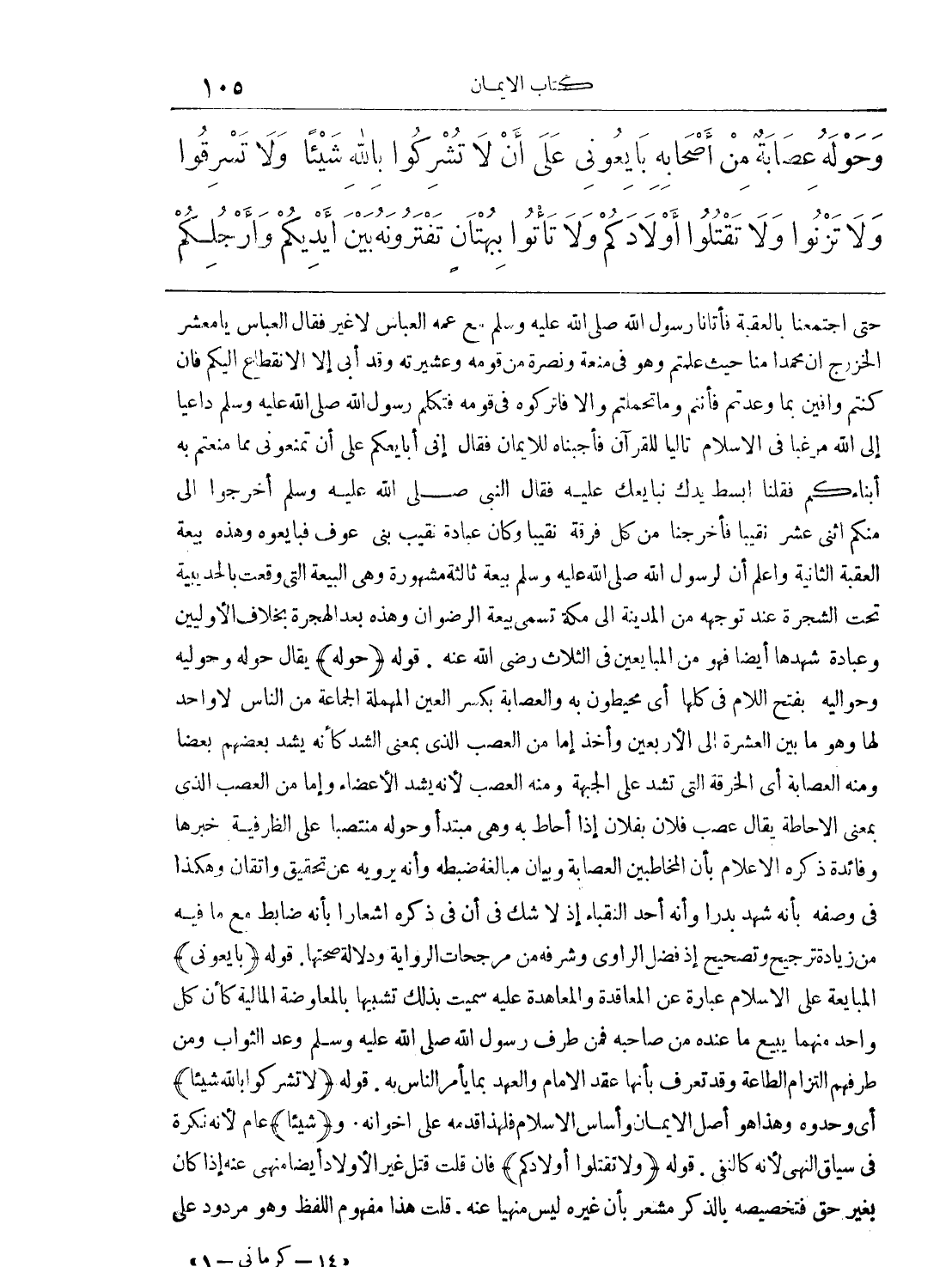 حتى اجتمعنا بالعقبة فأتانا رسول الله صلى الله عليه وسلم مع عمة العباس لا غير فقال العباس يا معضر الخزرج ان محمدا منا حيث علمتهم وهو فى منعة ونصرة من قومه وعشيرته وقد أبى الا الانقطاع اليكم فان كنتم وافين بما وعدتم فأنتم وما تحملتم والا فاتركوه فى قومه هتكلم رسول الله صلى الله عليه وسلم داعيا الى الله مرغبا فى الاسلام تاليا للقرأن فأجبناه للايمان فقال انى ابايعكم على أن تمتعونى مما منعتم به أبناءكم فقلنا ابسط يدك نبايعك عليه فقال النبى صلى الله عليه وسلم أخرجوا الى منكم اثنى عشر نقيبا فأحرجنا من كل فرقة نقيبا وكان عبايدة نقيب بنى عوف فبايعوه وهذه بيعة العقبة الثانية واعلم أن لرسول الله صلى الله عليه وسلم بيعة ثالثة مشهورة وهى البيعة التى وقعت بالحدبية تحت الشجرة عند توجهه من المبايعين فى الثلاث رضى الله عنه. قوله: (حوله) يقال حوله وحوليه وحواليه بفتح اللام فى كلها أى محيطون به والعصابة بكسر العين المهملة الجماعة من الناس لا واحد لها وهو ما بين العشرة الى الأربعين وأخذ اما من العصب الذى بمنى الشد كأنه يشد بعضهم بعضا ومنه العصابة أى الخرقة التى تشد على الجهة ومنه العصب لأنه يشد الاعضاء واما من العصب الذى بمعنى الاحاملة يقال عصب فلان بفلان اذا أحاط به وهى مبتدأ وحوله منتصبا على الظرفية خبرها وفائدة ذكره الاعلام بأن المخاطبين العصابة وبيان مبالغة ضبكه وأنه يرويه عن تحقيق واتقان وهكذا فى وصفه بأنه شهد بدرا وأنه احد النقباء اذ لا شك فى أن فى ذكره اشعارا بأنه ضابط مع مافيه من زيادة جيح وتصحيح اذا فضل الراوى وشرفه من مرجحات الروياة ودلالة صحتها. قوله: (بايعونى) المبايعة على الاسلام عبارة عن المعاقده والمعاهدة عليه سميت بذلك تشبيها بالمعاوضة المالية كأن كل واحد منهما يبيع ما عنده من صاحب فمن طرف رسول الله صلى الله عليه وسلم وعد الثواب ومن طرفهم التزام الطاعة وقد تعرف بأنها عقد الامام والعهد بما يأمر الناس به. قوله: (لا تشركوا بالله شيئا) أى وحدوه وهذا هو أصل الايمان وأساس الاسلام فلهذا قدمه على اخواته و (شيئا) عام لانه نكرة فى سياق النى لأنه كالنفى. قوله: (ولا تقتلوا أولادكم) فان قلت قتل غير الأولاد أيضا منهى عنه اذا كان بغير حق فتخصيصه بالذكر مشعر بأن غيره ليش منهيا عنه. قل هذا مفهوم اللفظ وهو مردود على