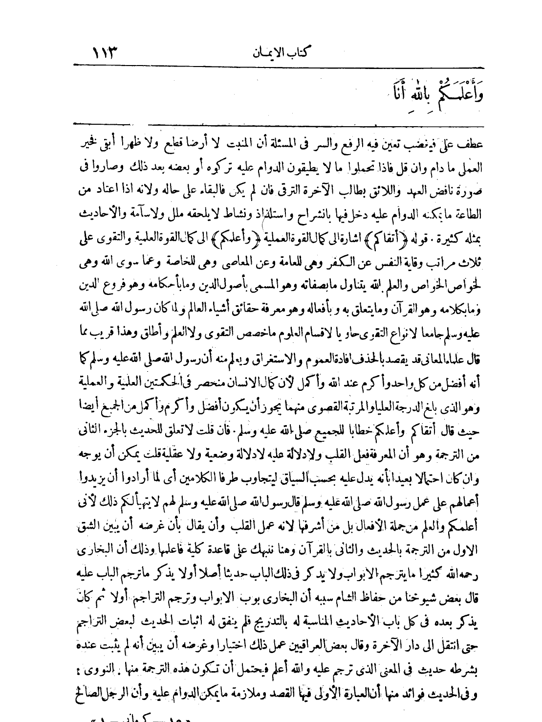 عطف على فيغضب تعين فيه الرفع والسر في المسئلة أن المنبتّ لا أرضا قطع ولا ظهرا أبقى فخير العمل مادام وإن قلّ فغذا تحمّلوا مالا يطيقون الدوام عليه تركوه او بعضه بعد ذلك وصاروا في صورة ناقض العهد واللائق بطالب الىخرة الترقي فإن لم يكن فالبقاء على حاله ولأنّه إذا اعتاد من الطاعة ما يمكنه الدوام عليه دخل فيها بانشراح واسلتذاذ ونشاط لا يلحقه ملل ولا سآمة والأحاديث بمثله كثيرة. قوله ((أتقاكم)) إشارة إلى كمال القوة العقلية ((وأعلمكم)) إلى كمال القوة العلمية والتقوى على ثلاث مراتب وقاية النفس عن الكفر وهي للعامة وعن المعاصي وهي للخاصة وعمّا سوى الله وهي لخواص الخواص والعلم بالله يتناول ما بصفاته وهو المسمى بأصول الدين وما باحكامه وهو فروع الدين وما بكلامه وهو القرآن وما يتعلق به وبأفعاه وهو معرفة حقائق اشياء العالم ولما كان رسول الله صلى الله عليه وسلم جامعا لأنواع التقوى حاويا لأقسام العلوم ما خصص التقوى ولا العلم وأطلق وهذا قريب مما قال علماء المعاني قد يقصد بالحذف إفادة العموم والاستغراق ويعلم منه أن رسول الله صلى الله عليه وسلّم كما انه أفضل من كل واحد وأكرم عند الله واكمل لأن مال الإنسان منحصر في الحكمتين العلمية والعملية وهو الذي بلغ الدرجة العليا والمرتبة القصوى منهما يجوز أن يكون أفضل واكرم واكمل من الجميع أيضاحيث قال اتقاكم واعلمكم خطابا للجميع صلى الله عليه وسلم. فإن قلت لا تعلق للحديث بالجزء الثاني من الترجمة وهو أن المعرفة فعل القلب ولا دلالة عليه لا دلالة وضعية ولا عقلية قلت يمكن أن يوجه وإن كان احتمالا بعيدا بأنه يدل عليه بحسب السياق ليتجاوب طرفا الكلامين أي لما ارادو أن يزيدوا اعمالهم على عمل رسول الله 6 قال رسول الله6 لهم لا يتهيأ لكم ذلك لأني أعلمكم والعلم من جملة الافعال بل اشرفها لانه عمل القلب وان يقال بأن غرضه أن يبين الشق الاول من الترجمة بالحديث والثاني بالقرآن وهنا ننبهك على قاعدة كلية فاعلمها وذلك أن البخاري رحمه الله كثيرا ما يترجم الأبواب ولا يذكر في ذلك حديثا أصلا أو لا يذكر ما ترجم الباب عليه قال بعض شيوخنا من حفاظ الشام سببه أن البخاري بوب الأبواب وترجم التراجم أولا ثم كان يذكر بعده في كل باب الأحاديث المناسبة له بالتدريج فلم يتفق له إثبات الحديث لبعض التراجم حتى انتقل إلى دار الآخرة وقال بعض العراقيين عمل ذلك اختيارا وغرضه أن يبين أنه لم يثبت عنده بشرطه حديث في المعنى الذي ترجم عليه والله أعلم فيحتمل أن تكون الترجمة منها. النووي: وفي الحديث فوائد منها أن العبارة الاولى فيها القصد وملازمة ما يمكن الدوام عليه وان الرجل الصالح