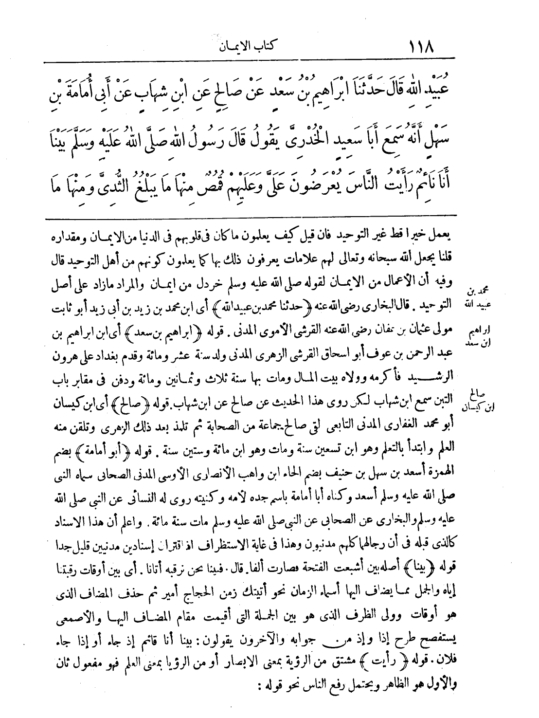 عُبَيْدِ اللهِ، قَالَ: حَدَّثنا إِبْرَاهِيمُ بْنُ سَعْدٍ، عَنْ صَالِحٍ، عَنِ ابْنِ شِهَابٍ، عَنْ أَبِي أُمَامَةَ بْنِ سَهْلٍ أَنَّهُ سَمِعَ أَبَا سَعِيدٍ الخُدْرِيَّ يَقُولُ: قَالَ رَسُولُ اللهِ صَلى الله عَلَيهِ وسَلمَ: بَيْنَا أَنَا نَائِمٌ، رَأَيْتُ النَّاسَ يُعْرَضُونَ عَلَيَّ وَعَلَيْهِمْ قُمُصٌ، مِنْهَا مَا يَبْلُغُ الثُّدِيَّ، وَمِنْهَا مَا