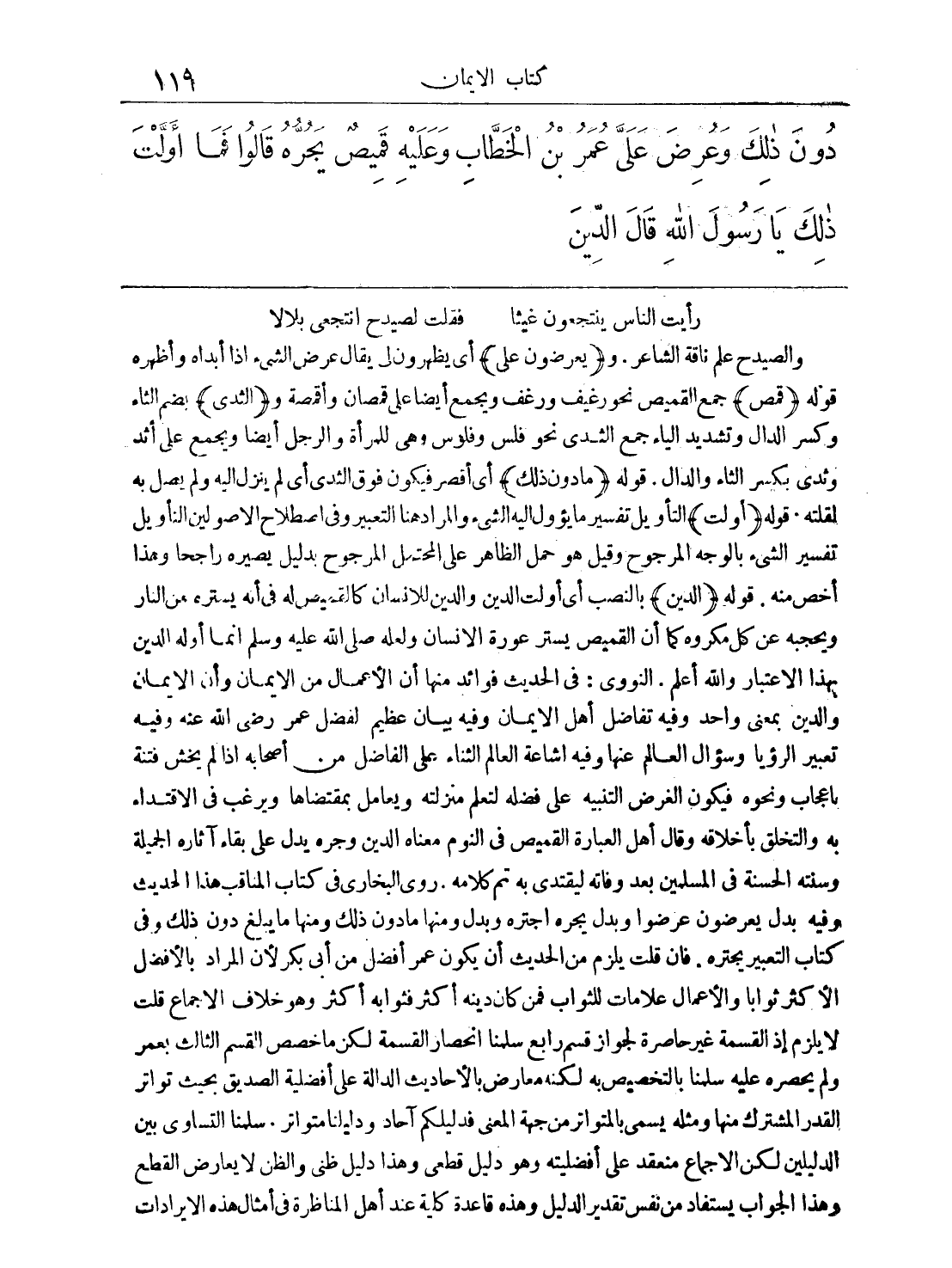 والصيدح علم ناقة الشاعر. و (يعرضون علي) أي يظهرون لي يقال عرض الشئ إذا أبداه وأظهره قوله: (قمص) جمع القميص نحو رغيف ورغف ويجمع أيضاً على قمصان وأقمصة و (الثدي) بضم الثاء وكسر الدال وتشديد الياء جمع الثدي نحو فلس وفلوس وهي للمرأة والرجل أيضاً ويجمع على أثد وثدي بكسر الثاء والدال. قوله: (ما دون ذلك) أي أقصر فيكون فوق الثدي أي لم ينزل إليه ولم يصل به لقلته. قوله: (أولت) التأويل تفسير ما يؤول إليه الشئ والمراد هنا التعبير وفي اصطلاح الأصوليين التأويل تفسير الشئ بالوجه المرجوح وقيل هو حمل الظاهر على المحتمل المرجوح بدليل يصيره راجحاً وهذا أخص منه. قوله: (الدين) بالنصب أي أولت الدين والدين للإنسان كالقميص له في أنه يستره من النار ويحجبه عن كل مكروه كما أن القميص يستر عورة الإنسان ولعله صلى الله عليه وسلم إنما أوله الدين بهذا الاعتبار والله أعلم. النووي: في الحديث فوائد منها أن الأعمال من الإيمان وأن الإيمان والدين بمعنى واحد وفيه تفاضل أهل الإيمان وفيه بيان عظيم لفضل عمر رضي الله عنه وفيه تعبير الرؤيا وسؤال العالم عنها وفيه إشاعة العالم الثناء على الفاضل من أصحابه إذا لم يخش فتنة بإعجاب ونحوه فيكون الغرض التنبيه على فضله لتعلم منزلته ويعامل بمقتضاها ويرغب في الاقتداء به والتخلق بأخلاقه وقال أهل العبارة القميص في النوم معناه الدين وجره يدل على بقاء آثاره الجميلة وسنته الحسنة في المسلمين بعد وفاته ليقتدي به تم كلامه. روى البخاري في كتاب المناقب هذا الحديث وفيه بدل يعرضون عرضوا وبدل يجره اجتره وبدل ومنها ما دون ذلك ومنها ما يبلغ دون ذلك وفي كتاب التعبير يجتره. فإن قلت يلزم من الحديث أن يكون عمر أفضل من أبي بكر لأن المراد بالأفضل الأكثر ثواباً والأعمال علامات للثواب فمن كان دينه أكثر فثوابه أكثر وهو خلاف الإجماع قلت لا يلزم إذ القسمة غير حاصرة لجواز قسم رابع سلمنا انحصار القسمة لكن ما خصص القسم الثالث بعمر ولم يحصره عليه سلمنا بالتخصيص به لكنه معارض بالأحاديث الدالة على أفضلية الصديق بحيث تواتر القدر المشترك منها ومثله يسمى بالمتواتر من جهة المعنى فدليلكم آحاد ودليلنا متواتر. سلمنا التساوي بين الدليلين لكن الإجماع منعقد على أفضليته وهو دليل قطعي وهذا دليل ظني والظن لا يعارض القطع وهذا الجواب يستفاد من نفس تقدير الدليل وهذه قاعدة كلية عند أهل المناظرة في أمثال هذه الإيرادات