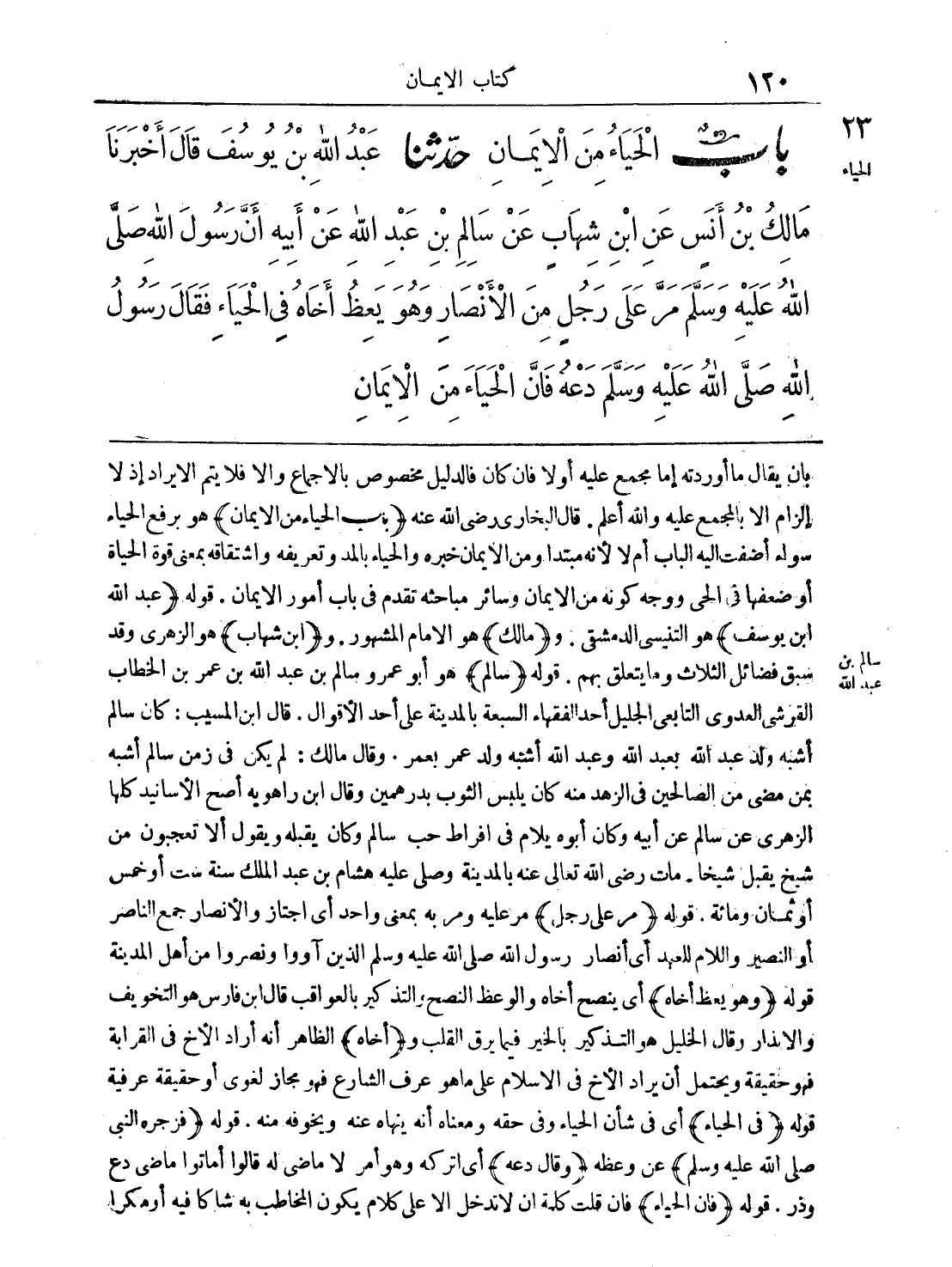 بأن يقال ما أوردته إما مجمع عليه أولاً فإن كان فالدليل مخصوص بالإجماع وإلا فلا يتم الإيراد إذ لا إلزام إلا بالمجمع عليه والله أعلم. قال البخاري رضي الله عنه (باب الحياء من الإيمان) هو برفع الحياء سواء أضفت إليه الباب أم لا لأنه مبتدأ ومن الإيمان خبره والحياء بالمد وتعريفه واشتقاقه بمعنى قوة الحياء أو ضعفها في الحي ووجه كونها من الإيمان وسائر مباحثه تقدم في باب أمور الإيمان. قوله: (عبد الله بن يوسف) هو التنيسي الدمشقي. و (مالك) هو الإمام المشهور. و (ابن شهاب) هو الزهري وقد سبق فضائل الثلاث وما يتعلق بهم. قوله: (سالم) هو أبو عمرو سالم بن عبد الله بن عمر بن الخطاب القرشي العدوي التابعي الجليل أحد الفقهاء السبعة بالمدينة على أحد الأقوال. قال ابن المسيب: كان سالم أشبه ولد عبد الله بعبد الله وعبد الله أشبه ولد عمر بعمر. وقال مالك: لم يكن في زمن سالم أشبه بمن مضى من الصالحين في الزهد منه كان يلبس الثوب بدرهمين وقال ابن راهوية أصح الأسانيد كلها الزهري عن سالم عن أبيه وكان أبوه يُلام في إفراط حب سالم وكان يقبله ويقول ألا تعجبون من شيخ يقبل شيخاً- مات رضي الله تعالى عنه بالمدينة وصلى عليه هشام بن عبد الملك سنة ست أو خمس أو ثمان ومائة. قوله: (مر علي رجل) مر عليه ومر به بمعنى واحد أي اجتاز والأنصار جمع الناصر أو النصير واللام للعهد أي أنصار رسول الله صلى الله عليه وسلم الذين آووا ونصروا من أهل المدينة قوله: (وهو يعظ أخاه) أي ينصح أخاه والوعظ النصح والتذكير بالعواقب قال ابن فارس هو التخويف والإنذار وقال الخليل هو التذكير بالخير فيما يرق القلب و (أخاه) الظاهر أنه أراد الأخ في القرابة هو حقيقة ويحتمل أن يراد الأخ في الإسلام على ما هو عرف الشارع فهو مجاز لغوي أو حقيقة عرفية قوله: (في الحياء) أي في شأن الحياء وفي حقه ومعناه أنه ينهاه عنه ويخوفه منه. قوله: (فزجره النبي صلى الله عليه وسلم) عن وعظه (وقال دعه) أي اتركه وهو أمر لا ماضي له قالوا أماتوا ماضي دع وذر. قوله: (فإن الحياء) فإن قلت كلمة أن لا تدخل إلا على كلام يكون المخاطب به شاكاً فيه أو مكراً