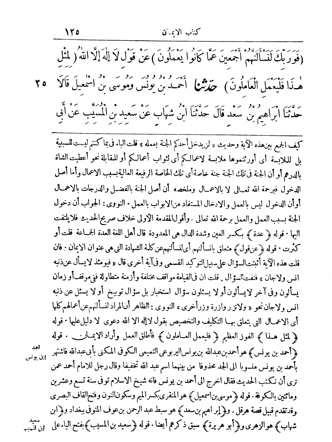 كيف الجمع بين هذه الآية وحديث "لن يدخل أحدكم الجنة بعمله" قلت الباء في بما كنتم ليست للسببية بل للملابسة أي أورثتموها ملابسة لأعمالكم أي لثواب أعمالكم أو للمقابلة نحو أعطيت الشاة بالدرهم أو أن الجنة في تلك الجنة جنة خاصة أي تلك الخاصة الرفيعة العالية بسبب الأعمال وأما أصل الدخول فبرحمة الله تعالى لا بالأعمال وملخصه أن أصل الجنة بالفضل والدرجات بالأعمال أو أن الدخول ليس بالعمل والإدخال المستفاد من الأبواب بالعمل. النووي: الجواب أن دخول الجنة بسبب العمل والعمل برحمة الله تعالى. وأقول المقدمة الأولى خلاف صريح الحديث فلا يلتفت إليها. قوله: (عدة) بكسر العين وشدة الدال هي المعدودة قال أهل اللغة العدة الجماعة قلت أو كثرت. قوله: (عن قول) متعلق بلنسألنهم أي لنسألنهم عن كلمة الشهادة التي هي عنوان الإيمان. فإن قلت هذه الآية أثبتت السؤال على سبيل التوكيد القسمي وفي آية أخرى قال (فيومئذ لا يسأل عن ذنبه إنس ولا جان) فنفت السؤال. قلت إن في القيامة مواقف مختلفة وأزمنة متطاولة ففي موقف أو زمان يسألون وفي آخر لا يسألون أو لا يسئلون سؤال استخبار بل سؤال توبيخ أو لا يسئل عن ذنبه إنس ولا جان نحو (ولا تزر وازرة وزر أخرى) النووي: الظاهر أن المراد لنسألنهم عن أعمالهم كلها أي الأعمال التي يتعلق بها التكليف والتخصيص بقول لا إله إلا الله دعوى لا دليل عليها. قوله: (لمثل هذا) الفوز العظيم (فليعمل العاملون) فأطلق العمل وأراد الإيمان. قوله: (أحمد بن يونس) هو أحمد بن عبد الله بن يونس اليربوعي التميمي الكوفي المكني بأبي عبد الله فاشتهر بأحمد بن يونس منسوباً إلى الجد محذوفاً من بينهما اسم عبد الله تخفيفاً وقال رجل للإمام أحمد عمن ترى أن نكتب الحديث فقال اخرج إلى أحمد بن يونس فإنه شيخ الإسلام توفي سنة تسع وعشرين ومائتين بالكوفة. قوله: (موسى بن إسمعيل) هو المنقري بكسر الميم وسكون النون وفتح القاف البصري وقد تقدم قبيل قصة هرقل. و (إبراهيم بن سعد) هو سبط عبد الرحمن بن عوف المتوفى ببغداد و (ابن شهاب) هو الزهري و (أبو هريرة) سبق ذكرهم أيضاً. قوله: (سعيد بن المسيب) بفتح الياء على