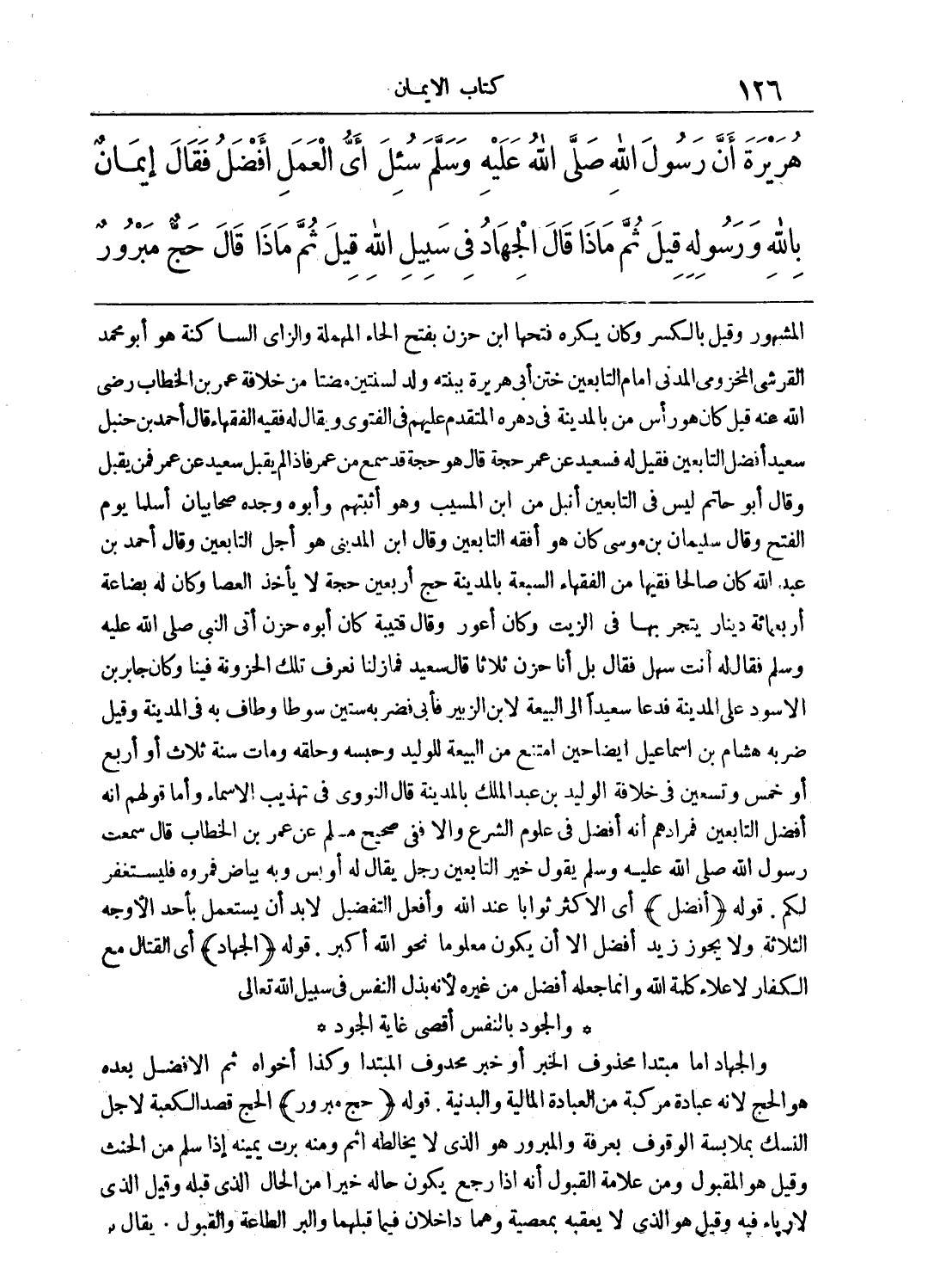 المشهور وقيل بالكسر وكان يكره فتحها ابن حزن بفتح الحاء المهملة والزاي الساكنة هو أبو محمد القرشي المخزومي المدني أمام التابعين ختن أبي هريرة ببنته ولد لسنتين مضتا من خلافة عمر بن الخطاب رضي الله عنه قبل كان هو رأس من بالمدينة في دهره المتقدم عليهم في الفتوى ويقال له فقيه الفقهاء قال أحمد بن حنبل سعيد أفضل التابعين فقيل له فسعيد عن عمر حجة قال هو حجة قد سمع من عمر فإذا لم يقبل سعيد عن عمر فمن يقبل وقال أبو حاتم ليس في التابعين أنبل من ابن المسيب وهو أثبتهم وأبوه وجده صاحبيان أسلما يوم الفتح وقال سليمان بن موسى كان هو أفقه التابعين وقال ابن المديني هو أجل التابعين وقال أحمد بن عبد الله كان صالحاً فقيهاً من الفقهاء السبعة بالمدينة حج أربعين حجة لا يأخذ العصا وكان له بضاعة أربعمائة دينار يتجر بها في الزيت وكان أعور وقال قتيبة كان أبوه حزن أتى النبي صلى الله عليه وسلم فقال له أنت سهل فقال بل أنا حزن ثلاثاً قال سعيد فما زلنا نعرف تلك الحزونة فينا وكان جابر بن الأسود على المدينة فدعا سعيداً إلى البيعة لابن الزبير فأبي نضر به ستين سوطاً وطاف به في المدينة وقيل ضربه هشام بن إسماعيل إيضاحين امتنع من البيعة للوليد وحبسه وحلقه ومات سنة ثلاث أو أربع أو خمس وتسعين في خلافة الوليد بن عبد الملك بالمدينة قال النووي في تهذيب الأسماء وأما قوله: م أنه أفضل التابعين فمرادهم أنه أفضل في علوم الشرع وإلا ففي صحيح مسلم عن عمر بن الخطاب قال سمعت رسول الله صلى الله عليه وسلم يقول خير التابعين رجل يقال له أو بس وبه بياض فمروه فليستغفر لكم. قوله: (أفضل) أي الأكثر ثواباً عند الله وأفعل التفضيل لابد أن يستعمل بأحد الأوجه الثلاثة ولا يجوز زيد أفضل إلا أن يكون معلوماً نحو الله أكبر. قوله: (الجهاد) أي القتال مع الكفار لإعلاء كلمة الله وإنما جعله أفضل من غيره لأنه بذل النفس في سبيل الله تعالى.