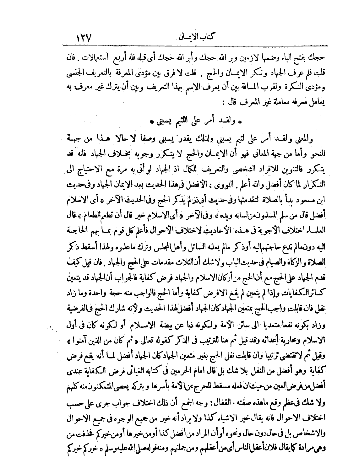 والمعنى ولقد أمر علي لئيم يسبني ولذلك يقدر يسبني وصفاً لا حالاً هذا من جهة النحو وأما من جهة المعاني فهو أن الإيمان والحج لا يتكرر وجوبه بخلاف الجهاد فإنه قد يتكرر فالتنوين للأفراد الشخصي والتعريف للكمال إذ الجهاد لو أتى به مرة مع الاحتياج إلى التكرار لما كان أفضل والله أعلم. النووي: الأفضل في هذا الحديث بعد الإيمان الجهاد وفي حديث ابن مسعود بدأ بالصلاة لتقدمتها وفي حديث أبي ذر لم يذكر الحج وفي الحديث الآخر (أي الإسلام أفضل قال من سلم المسلمون من لسانه ويده) وفي الآخر (أي الإسلام خير قال أن تطعم الطعام) قال العلماء اختلاف الأجوبة في هذه الأحاديث لاختلاف الأحوال فأعلم كل قوم بما بهم الحاجة إليه دون ما لم تدع حاجتهم إليه أو ذكر ما لم يعلمه السائل وأهل المجلس وترك ما علموه ولهذا أسقط ذكر الصلاة والزكاة والصيام في حديث الباب ولاشك أن الثلاث مقدمات على الحج والجهاد. فإن قيل كيف قدم الجهاد على الحج مع أن الحج من أركان الإسلام والجهاد فرض كفاية فالجواب أن الجهاد قد يتعين كسائر الكفايات وإذا لم يتعين لم يقع إلا فرض كفاية وأما الحج فالواجب منه حجة واحدة وما زاد نفل فإن قابلت واجب الحج بمتعين الجهاد كان الجهاد أفضل لهذا الحديث ولأنه شارك الحج في الفرضية وزاد بكونه نفعاً متعدياً إلى سائر الأمة ولكونه ذبا عن بيضة الإسلام أو لكونه كان في أول الإسلام ومحاربة أعدائه وقد قيل ثم هنا للترتيب في الذكر كقوله: تعالى (ثم كان من الذين آمنوا) وقيل ثم لا تقتضي ترتيباً وإن قابلت نفل الحج بغير متعين الجهاد كان الجهاد أفضل لما أنه يقع فرض كفاية وهو أفضل من النفل بلا شك بل قال إمام الحرمين في كتابه الغياثي فرض الكفاية عندي أفضل من فرض العين من حيث أن فعله مسقط للحرج عن الأمة بأسرها وبتركه يعصي المتمكنون منه كلهم ولاشك في عظم وقع ما هذه صفته. القفال: وجه الجمع أن ذلك اختلاف جواب جرى على حسب اختلاف الأحوال فإنه يقال خير الأشياء كذا ولا يراد أنه خير من جميع الوجوه في جميع الأحوال والأشخاص بل في حال دون حال ونحوه أو أن المراد من أفضل كذا أو من خيرها أو من خيركم فحذفت من وهي مرادة كما يقال فلان أعقل الناس أي من أعقلهم ومن جملتهم ومنه قوله: صلى الله عليه وسلم (خيركم خيركم