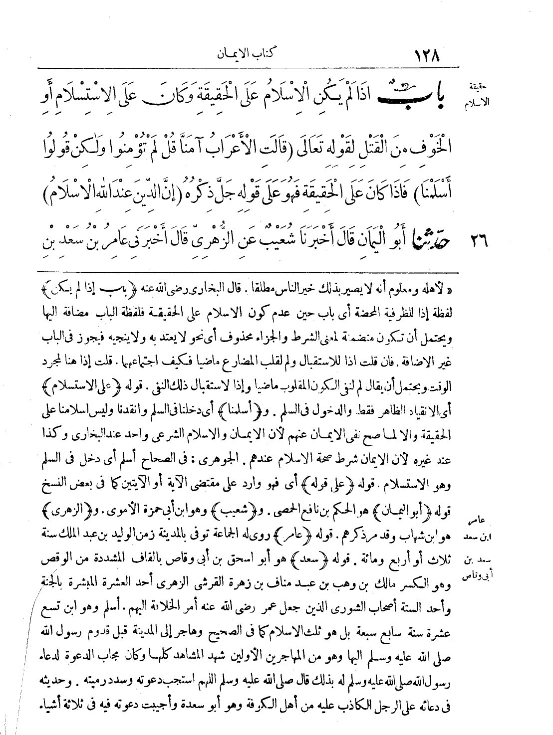 26 - حَدَّثنا أَبُو اليَمَانِ، قَالَ: أَخبَرَنا شُعَيْبٌ، عَنِ الزُّهْرِيِّ، قَالَ: أَخْبَرَنِي عَامِرُ بْنُ سَعْدِ بْنِ