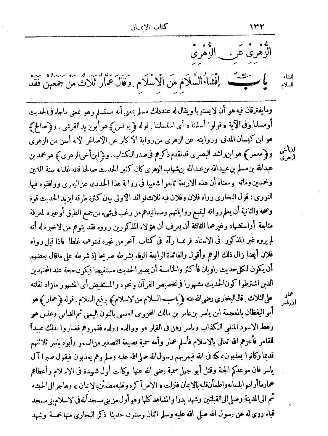 وما يفترقان فيه هو أن لا يستويا ويقال له عند ذلك مسلم بمعنى أنه مستسلم وهو بمعنى ما جاء في الحديث أو مسلماً وفي الآية (قولوا أسلمنا) أي استسلمنا. قوله: (يونس) هو أبو يزيد القرشي. و (صالح) هو ابن كيسان المدني وروايته عن الزهري من رواية الأكابر عن الأصاغر لأنه أسن من الزهري و (معمر) هو ابن راشد البصري قد تقدم ذكرهم في صدر الكتاب. و (ابن أخي الزهري) هو محمد بن عبد الله بن مسلم بن عبيد الله بن عبد الله بن شهاب الزهري كان كثير الحديث صالحاً قتله غلمانه سنة اثنتين وخمسين ومائة ومعناه أن هذه الأربعة تابعوا شعيباً في رواية هذا الحديث عن الزهري ووافقوه فيها النووي: قول البخاري رواه فلان وفلان فيه ثالث فوائد الأولى بيان كثرة طرقه ليزيد الحديث قوة وصحة والثانية أن يعلم رواته ليتبع رواياتهم ومسانيدهم من رغب في شيء من جمع الطرق أو غيره لمعرفة متابعة أو استشهاد وغيرهما الثالثة أن يعرف أن هؤلاء المذكورين رووه فقد يتوهم من لا خبرة له أنه لم يروه غير المذكور في الإسناد فربما رآه في كتاب آخر من غيره فتوهمه غلطاً فإذا قيل رواه فلان أيضاً زال ذلك الوهم وأقول والفائدة الرابعة الوفاء بشرطه صريحاً إذ شرطه على ما قال بعضهم أن يكون لكل حديث راويان فأكثر والخامسة أن يصير الحديث مستفيضاً فيكون حجة عند المجتهدين الذين اشترطوا كون الحديث مشهوراً في تخصيص القرآن ونحوه والمستفيض أيا لمشهور ما زاد نقلته على الثلاث. قال البخاري رضي الله عنه (باب السلام من الإسلام) برفع السلام. قوله: (عمار) هو أبو اليقظان بالمعجمة ابن ياسر بن عامر بن مالك المخزومي العنسي بالنون اليمني ثم الشامي وعنس هو رهط الأسود المتنبي الكذاب وياسر رهن في القمار هو ووالده وولده فقمروهم فصاروا بذلك عبيداً للقامر فأعزهم الله تعالى بالإسلام فأسلم عمار وأمه سمية بصيغة التصغير من السمو وأبوه ياسر ثلاثتهم قديماً وكانوا يعذبون بمكة في الله فيمر بهم رسول الله صلى الله عليه وسلم وهم يعذبون فيقول صبراً آل ياسر فإن موعدكم الجنة وقتل أبو جهل سمية رضي الله عنها وكانت أول شهيدة في الإسلام وأعطاهم عمار ما أرادوا بلسانه واطمأن قلبه بالإيمان فنزلت (إلا من أكره وقلبه مطمئن بالإيمان) وهاجر إلى الحبشة ثم إلى المدينة وصلى إلى القبلتين وشهد بدرا والمشاهد كلها وهو أول من بنى مسجد الله في الإسلام بني مسجد قباء روى له عن رسول الله صلى الله عليه وسلم اثنان وستون حديثاً ذكر البخاري منها خمسة وشهد