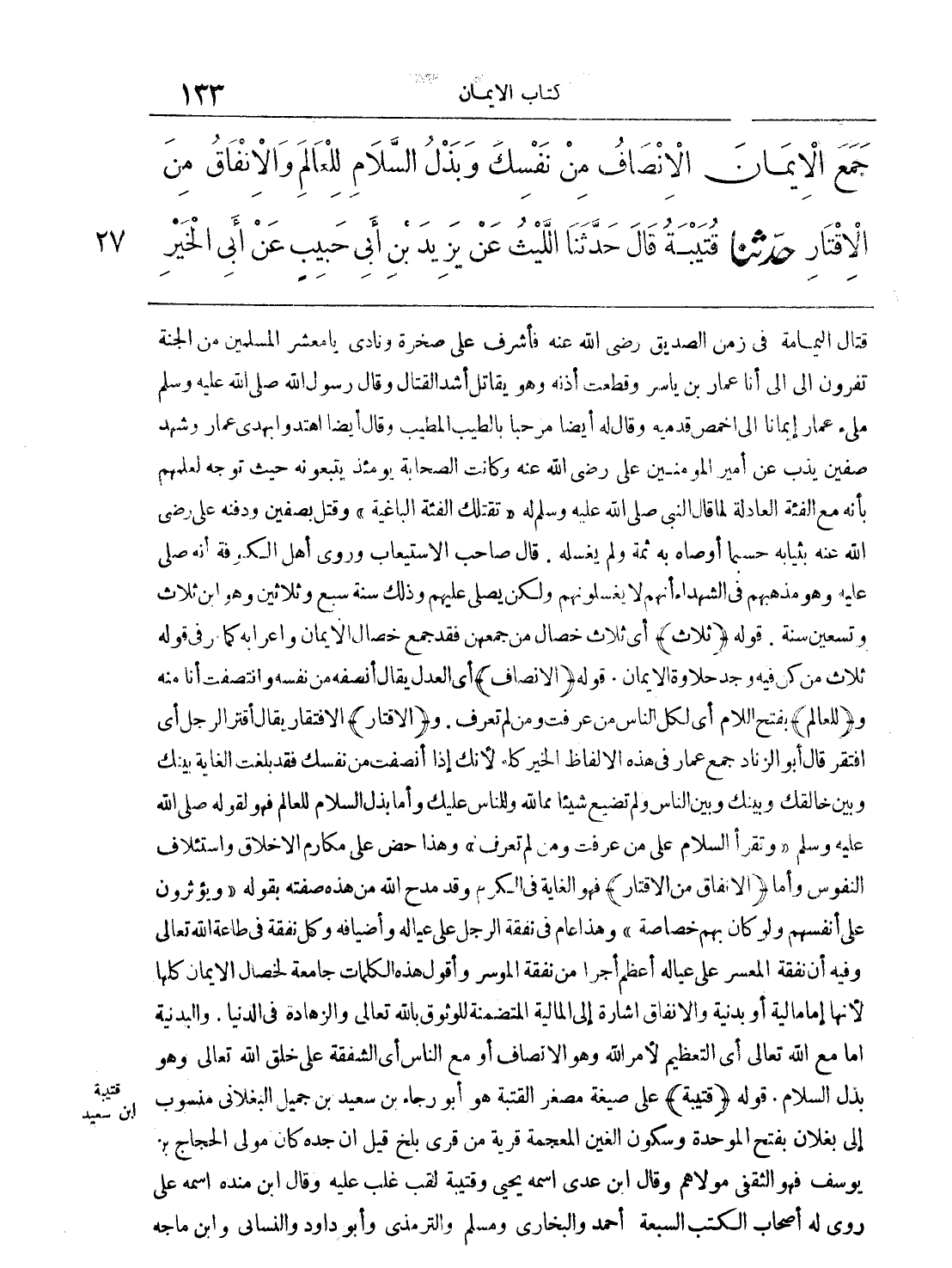 قتال اليمامة في زمن الصديق رضي الله عنه فأشرف على صخرة ونادى يا معشر المسلمين من الجنة تفرون إلي أنا عمار بن ياسر وقطعت أذنه وهو يقاتل أشد القتال وقال رسول الله صلى الله عليه وسلم ملئ عمار إيماناً إلى أخمص قدميه وقال له أيضاً مرحباً بالطيب المطيب وقال أيضاً اهتدوا بهدى عمار وشهد صفين يذب عن أمير المؤمنين علي رضي الله عنه وكانت الصحابة يومئذ يتبعونه حيث توجه لعلمهم بأنه مع الفئة العادلة لما قال النبي صلى الله عليه وسلم له (تقتلك الفئة الباغية) وقتل بصفين ودفنه علي رضي الله عنه بثيابه حسبما أوصاه به ثمة ولم يغسله. قال صاحب الاستيعاب وروى أهل الكوفة أنه صلى عليه وهو مذهبهم في الشهداء أنهم لا يغسلونهم ولكن يصلى عليهم وذلك سنة سبع وثلاثين وهو ابن ثلاث وتسعين سنة. قوله: (ثلاث) أي ثلاث خصال من جمعهن فقد جمع خصال الإيمان وإعرابه كما في قوله: ثلاث من كن فيه وجد حلاوة الإيمان. قوله: (الإنصاف) أي العدل يقال أنصفه من نفسه وانتصفت أنا منه و (للعالم) بفتح اللام أي لكل الناس من عرفت ومن لم تعرف. و (الإقتار) الافتقار يقال أقتر الرجل أي افتقر قال أبو الزناد جمع عمار في هذه الألفاظ الخير كله لأنك إذا أنصفت من نفسك فقد بلغت الغاية بينك وبين خالقك وبينك وبين الناس ولم تضيع شيئاً مما لله وللناس عليك وأما بذل السلام للعالم فهو لقوله: صلى الله عليه وسلم (وتقرأ السلام على من عرفت ومن لم تعرف) وهذا حض على مكارم الأخلاق واستئلاف النفوس وأما (الإنفاق من الإقتار) فهو الغاية في الكرم وقد مدح الله من هذه صفته بقوله: (ويؤثرون على أنفسهم ولو كان بهم خصاصة) وهذا عام في نفقة الرجل على عياله وأضيافه وكل نفقة في طاعة الله تعالى وفيه أن نفقة المعسر على عياله أعظم أجراً من نفقة الموسر وأقول هذه الكلمات جامعة لخصال الإيمان كلها لأنها إما مالية أو بدنية والإنفاق إشارة إلى المالية المتضمنة للوثوق بالله تعالى والزهادة في الدنيا. والبدنية أما مع الله تعالى أي التعظيم لأمر الله وهو الاتصاف أو مع الناس أي الشفقة على خلق الله تعالى وهو بذل السلام. قوله: (قتيبة) على صيغة مصغر القتبة هو أبو رجاء بن سعيد بن جميل البغلاني منسوب إلى بغلان بفتح الموحدة وسكون الغين المعجمة قرية من قرى بلخ قيل أن جده كان مولى الحجاج بن يوسف فهو الثقفي مولاهم وقال ابن عدي اسمه يحيى وقتيبة لقب غلب عليه وقال ابن منده اسمه على روى له أصحاب الكتب السبعة أحمد والبخاري ومسلم والترمذي وأبو داود والنسائي وابن ماجة