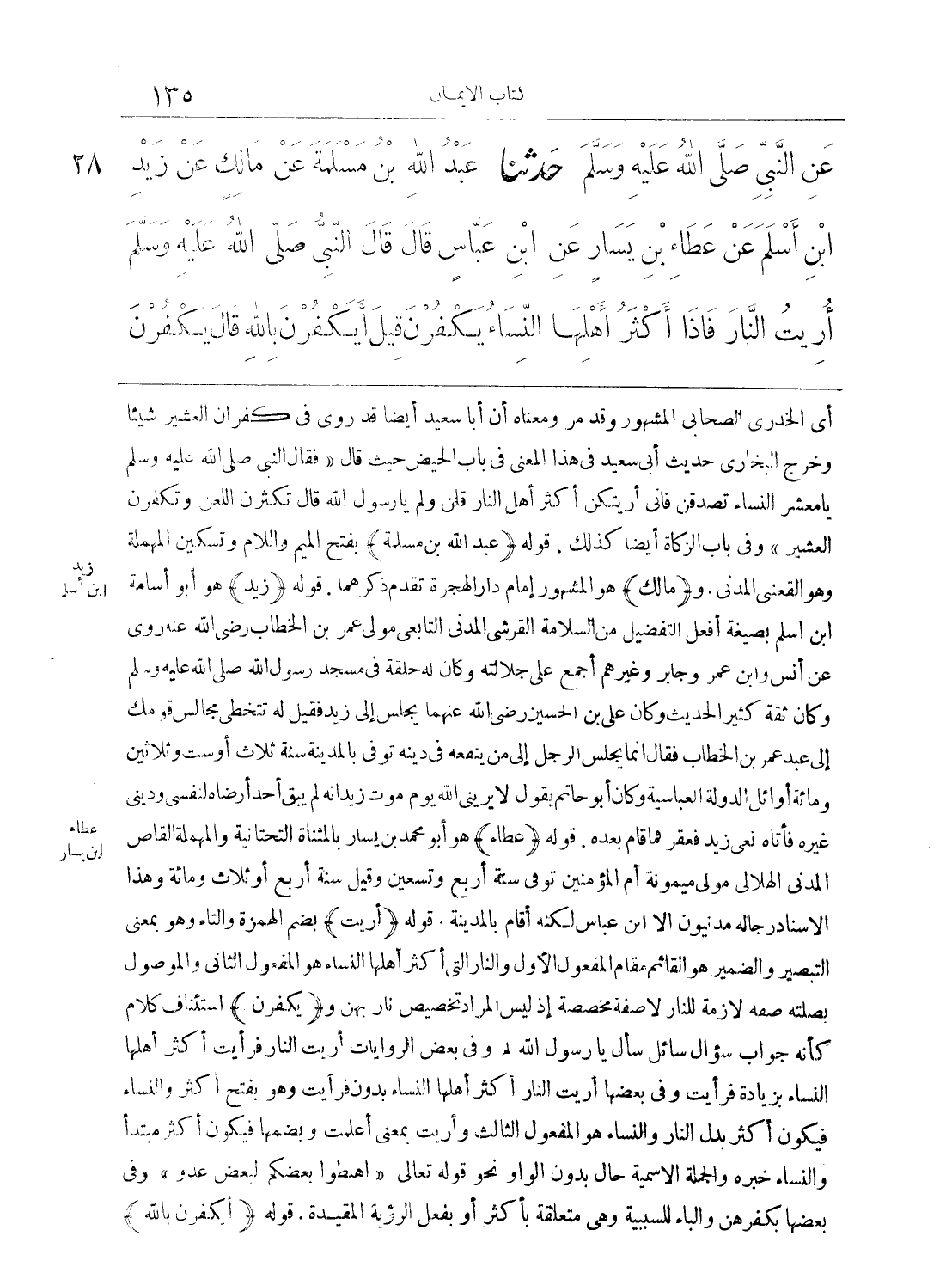 28 - حَدَّثنا عَبْدُ اللهِ بْنُ مَسْلَمَةَ، عَنْ مَالِكٍ، عَنْ زَيْدِ بْنِ أَسْلَمَ، عَنْ عَطَاءِ بْنِ يَسَارٍ، عَنِ ابْنِ عَبَّاسٍ، قَالَ: قَالَ النَّبِيُّ صَلى الله عَلَيهِ وسَلمَ: أُرِيتُ النَّارَ فَإِذَا أَكْثَرُ أَهْلِهَا النِّسَاءُ، يَكْفُرْنَ قِيلَ: أَيَكْفُرْنَ بِاللهِ؟ قَالَ: يَكْفُرْنَ