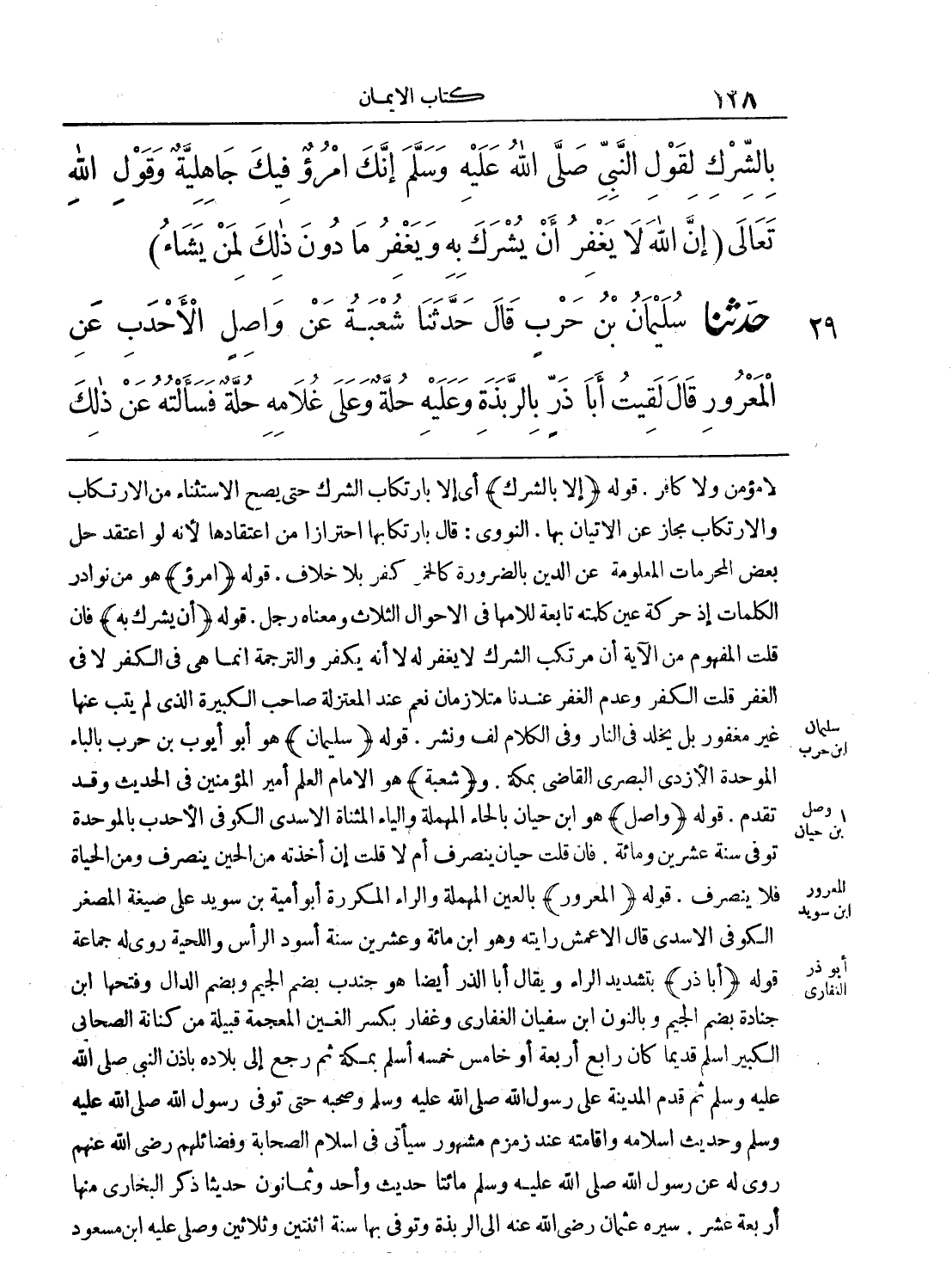 29 - حَدَّثنا سُلَيْمَانُ بْنُ حَرْبٍ، قَالَ: حَدَّثنا شُعْبَةُ، عَنْ وَاصِلٍ الأَحْدَبِ، عَنِ المَعْرُورِ، قَالَ: لَقِيتُ أَبَا ذَرٍّ بِالرَّبَذَةِ، وَعَلَيْهِ حُلَّةٌ، وَعَلَى غُلاَمِهِ حُلَّةٌ، فَسَأَلْتُهُ عَنْ ذَلِكَ