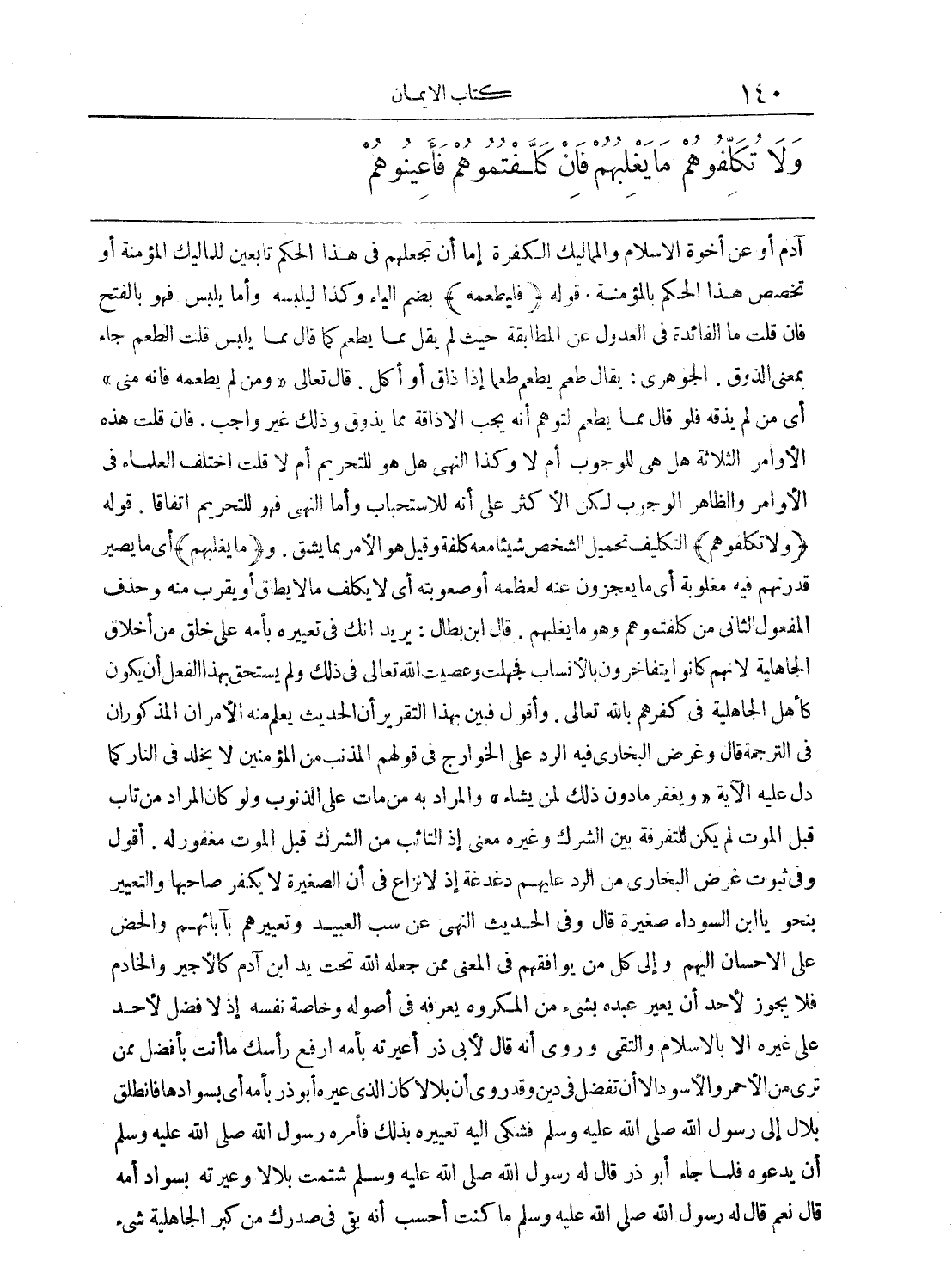 آدم أو عن أخوة الإسلام والمماليك الكفرة إما أن تجعلهم في هذا الحكم تابعين للمماليك المؤمنة أو تخصص هذا الحكم بالمؤمنة. قوله: (فليطعمه) بضم الياء وكذا ليلبسه وأما يلبس فهو بالفتح فإن قلت ما الفائدة في العدول عن المطابقة حيث لم يقل مما يطعم كما قال مما يلبس قلت الطعم جاء بمعنى الذوق. الجوهري: يقال طعم يطعم طعماً إذا ذاق أو أكل. قال تعالى (ومن لم يطعمه فإنه مني) أي من لم يذقه فلو قال مما يطعم لتوهم أنه يجب الإذاقة مما يذوق وذلك غير واجب. فإن قلت هذه الأوامر الثلاثة هل هي للوجوب أم لا وكذا النهي هل هو للتحريم أم لا قلت اختلف العلماء في الأوامر والظاهر الوجوب لكن الأكثر على أنه للاستحباب وأما النهي فهو للتحريم اتفاقاً. قوله: (ولا تكلفوهم) التكليف تحميل الشخص شيئاً معه كلفة وقيل هو الأمر بما يشق. و (ما يغلبهم) أي ما يصير قدرتهم فيه مغلوبة أي ما يعجزون عنه لعظمه أو صعوبته أي لا يكلف ما لا يطيق أو يقرب منه وحذف المفعول الثاني من كلفتموهم وهو ما يغلبهم. قال ابن بطال: يريد أنك في تعييره بأمه على خلق من أخلاق الجاهلية لأنهم كانوا يتفاخرون بالأنساب فجهلت وعصيت الله تعالى في ذلك ولم يستحق بهذا الفعل أني كون كأهل الجاهلية في كفرهم بالله تعالى. وأقول فبين بهذا التقرير أن الحديث يعلم منه الأمران المذكوران في الترجمة قال وغرض البخاري فيه الرد على الخوارج في قوله: م المذنب من المؤمنين لا يخلد في النار كما دل عليه الآية (ويغفر ما دون ذلك لمن يشاء) والمراد به من مات على الذنوب ولو كان المراد من تاب قبل الموت لم يكن للتفرقة بين الشرك وغيره معنى إذ التائب من الشرك قبل الموت مغفور له. أقول وفي ثبوت غرض البخاري من الرد عليهم دغدغة إذ لا نزاع في أن الصغيرة لا يكفر صاحبها والتعيير بنحو يا ابن السوداء صغيرة قال وفي الحديث النهي عن سب العبيد وتعييرهم بآبائهم والحض على الإحسان إليهم وإلى كل من يوافقهم في المعنى ممن جعله الله تحت يد ابن آدم كالأجير والخادم فلا يجوز لأحد أن يعير عبده بشيء من المكروه يعرفه في أصوله وخاصة نفسه إذ لا فضل لأحد على غيره إلا بالإسلام والتقى وروى أنه قال لأبي ذر أعيرته بأمه ارفع رأسك ما أنت بأفضل ممن ترى من الأحمر والأسود إلا أن تفضل في دين وقد روى أن بلالاً كان الذي عيره أبو ذر بأمه أي بسوادها فانطلق بلال إلى رسول الله صلى الله عليه وسلم فشكى إليه تعييره بذلك فأمره رسول الله صلى الله عليه وسلم أن يدعوه فملا جاء أبو ذر قال له رسول الله صلى الله عليه وسلم شتمت بلالاً وعيرته بسواد أمه قال نعم قال له رسول الله صلى الله عليه وسلم ما كنت أحسب أنه بقي في صدرك من كبر الجاهلية شيء
