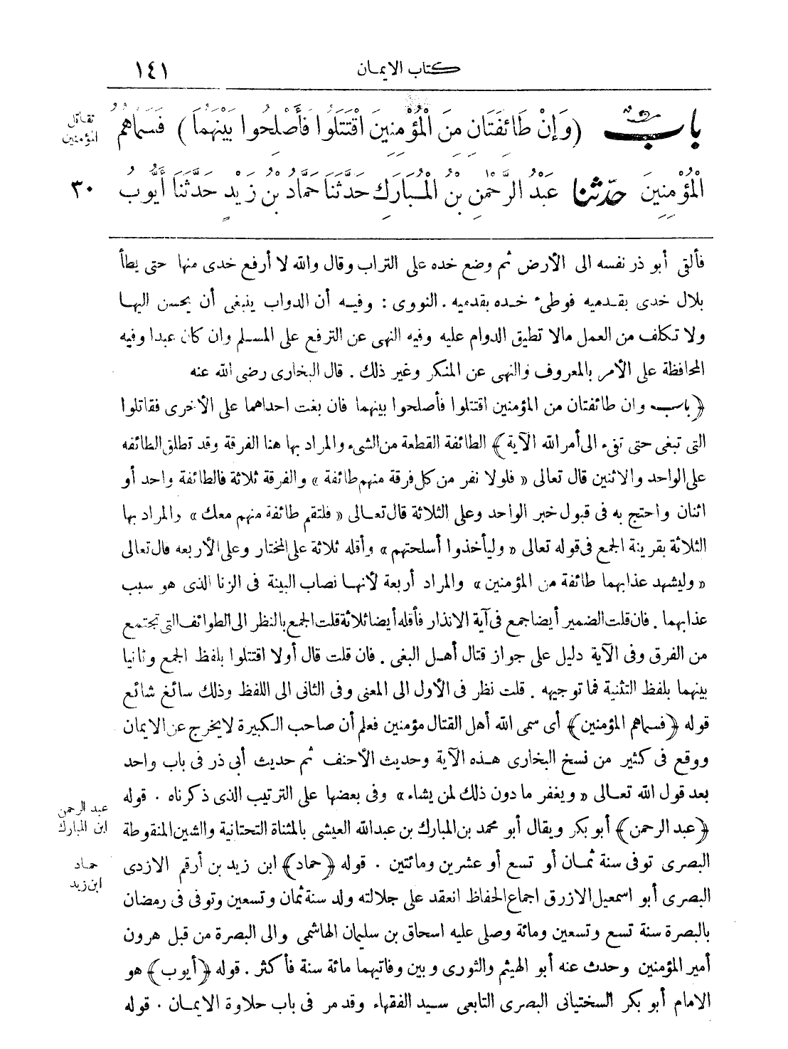 30 - حَدَّثنا عَبْدُ الرَّحْمَنِ بْنُ المُبَارَكِ، حَدَّثنا حَمَّادُ بْنُ زَيْدٍ، حَدَّثنا أَيُّوبُ