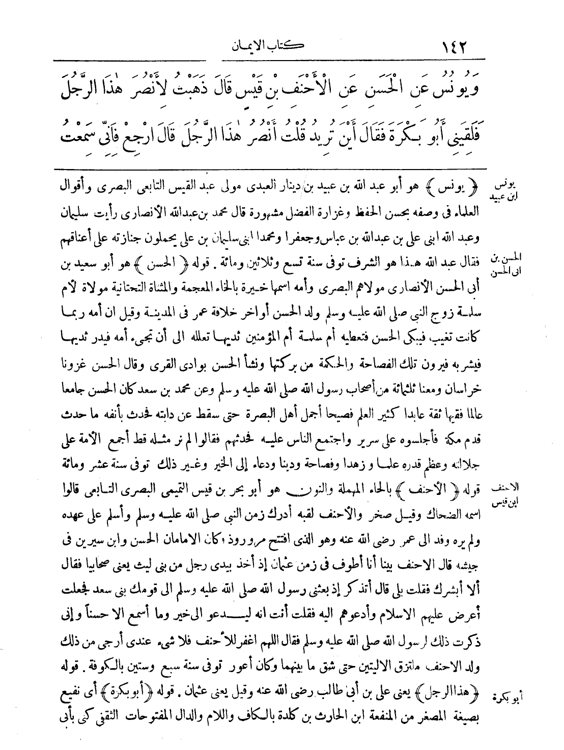 (يونس) هو أبو عبد الله بن عبيد بن دينار العبدي مولى عبد القيس التابعي البصري وأقوال العلماء في وصفه بحسن الحفظ وغزارة الفضل مشهورة قال محمد بن عبد الله الأنصاري رأيت سليمان وعبد الله ابني علي بن عبد الله بن عباس وجعفراً ومحمداً ابني سليمان بن علي يحملون جنازته على أعناقهم فقال عبد الله هذا هو الشرف توفي سنة تسع وثلاثين ومائة. قوله: (الحسن) هو أبو سعيد بن أبي الحسن الأنصاري مولاهم البصري وأمه اسمها خيرة بالخاء المعجمة والمثناة التحتانية مولاة لأم سلمة زوج النبي صلى الله عليه وسلم ولد الحسن أواخر خلافة عمر في المدينة وقيل أن أمه ربما كانت تغيب فيبكي الحسن فتعطيه أم سلمة أم المؤمنين ثديها تعلله إلى أن تجيء أمه فيدر ثديها فيشر به فيرون تلك الفصاحة والحكمة من بركتها ونشأ الحسن بوادي القرى وقال الحسن غزونا خراسان ومعنا ثلثمائة من أصحاب رسول الله صلى الله عليه وسلم وعن محمد بن سعد كان الحسن جامعاً عالماً فقيهاً ثقة عابداً كثير العلم فصيحاً أجمل أهل البصرة حتى سقط عن دابته فحدث بأنفه ما حدث قدم مكة فأجلسوه على سرير واجتمع الناس عليه فحدثهم فقالوا لم نر مثله قط أجمع الأمة على جلالته وعظم قدره علماً وزهداً وفصاحة وديناً ودعاء إلى الخير وغير ذلك توفي سنة عشر ومائة قوله: (الأحنف) بالحاء المهملة والنون هو أبو بحر بن قيس التميمي البصري التابعي قالوا اسمه الضحاك وقيل صخر والأحنف لقبه أدرك زمن النبي صلى الله عليه وسلم وأسلم على عهده ولم يره وفد إلى عمر رضي الله عنه وهو الذي افتتح مروروذ وكان الإمامان الحسن وابن سيرين في جيشه قال الأحنف بينما أنا أطوف في زمن عثمان إذ أخذ بيدي رجل من بني ليث يعني صحابياً فقال ألا أبشرك فقلت بلى قال أتذكر إذ بعثني رسول الله صلى الله عليه وسلم إلى قومك بني سعد فجعلت أعرض عليهم الإسلام وأدعوهم إليه فقلت أنت أنه ليدعو إلى خير وما أسمع إلا حسناً وإني ذكرت ذلك لرسول الله صلى الله عليه وسلم فقال اللهم اغفر للأحنف فلا شيء عندي أرجى من ذلك ولد الأحنف ملتزق الآليتين حتى شق ما بينهما وكان أعور توفي سنة سبع وستين بالكوفة. قوله: (هذا الرجل) يعني علي بن أبي طالب رضي الله عنه وقيل يعني عثمان. قوله: (أبو بكرة) أي نفيع بصيغة المصغر من المنفعة ابن الحارث بن كلدة بالكاف واللام والدال المفتوحات الثقفي كني بأبي