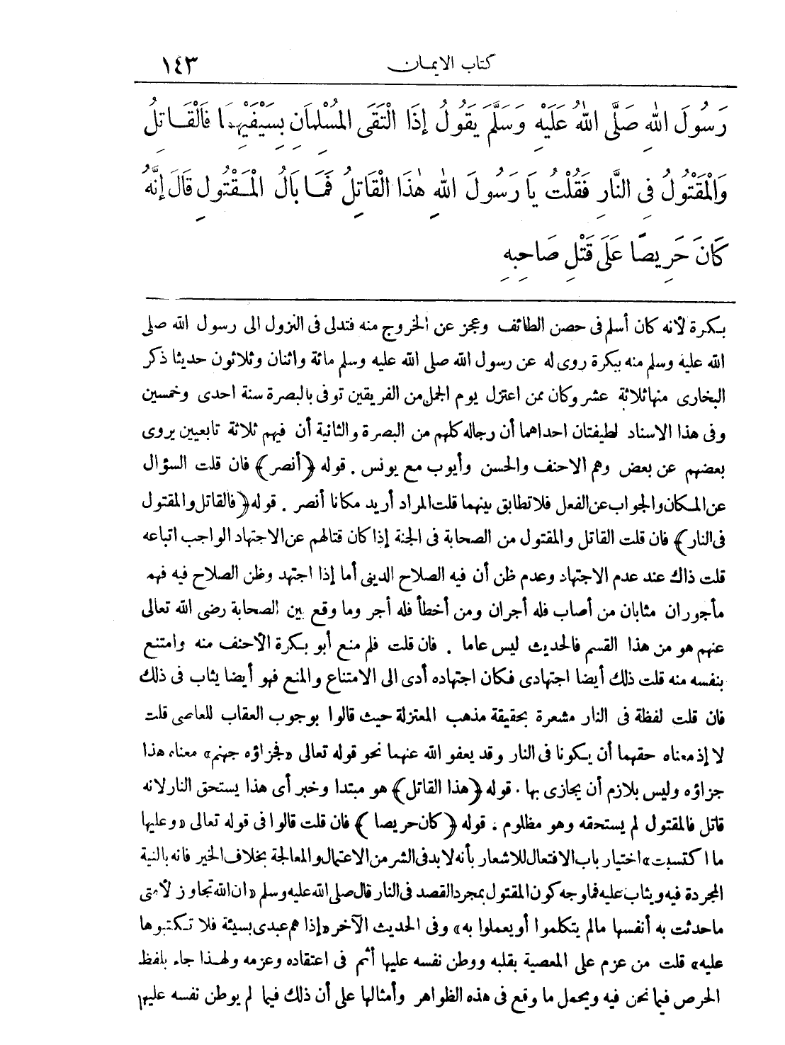 رَسُولَ اللهِ صَلى الله عَلَيهِ وسَلمَ يَقُولُ: إِذَا التَقَى المُسْلِمَانِ بِسَيْفَيْهِمَا، فَالقَاتِلُ وَالمَقْتُولُ فِي النَّارِ، فَقُلْتُ: يَا رَسُولَ اللهِ، هَذَا القَاتِلُ فَمَا بَالُ المَقْتُولِ؟ قَالَ: إِنَّهُ كَانَ حَرِيصًا عَلَى قَتْلِ صَاحِبِهِ.
