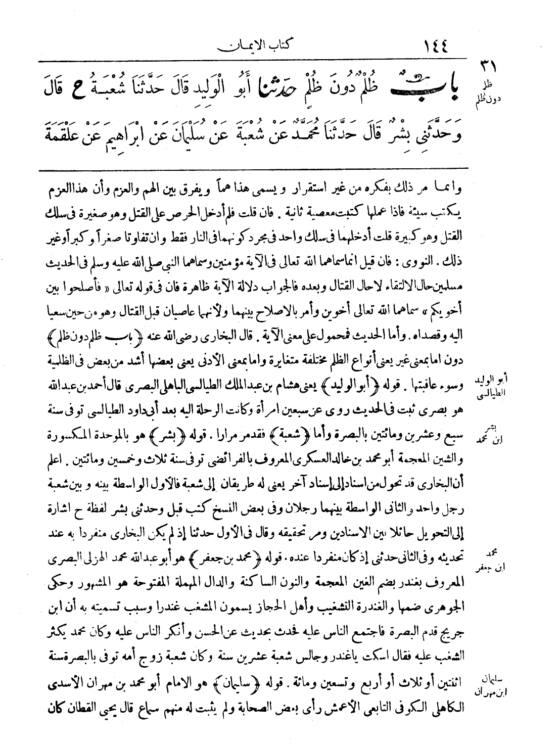 وإنما مر ذلك بفكره من غير استقرار ويسمى هذا هماً ويفرق بين الهم والعزم وأن هذا العزم يكتب سيئة فإذا عملها كتبت معصية ثانية. فإن قلت فلم أدخل الحرص على القتل وهو صغيرة في سلك القتل وهو كبيرة قلت أدخلهما في سلك واحد في مجرد كونهما في النار فقط وإن تفاوتا صغراً وكبراً وغير ذلك. النووي: فإن قيل أنما سماهما الله تعالى في الآية مؤمنين وسماهما النبي صلى الله عليه وسلم في الحديث مسلمين حال الالتقاء لا حال القتال وبعده فالجواب دلالة الآية ظاهرة فإن في قوله: تعالى (فأصلحوا بين أخويكم) سماهما الله تعالى أخوين وأمر بالإصلاح بينهما ولأنهما عاصيان قبل القتال وهو من حين سعيا إليه وقصداه. وأما الحديث فمحمول على معنى الآية. قال البخاري رضي الله عنه (باب ظلم دون ظلم) دون أما بمعنى غير يعني أنواع الظلم مختلفة متغايرة وإما بمعنى الأدنى يعني بعضها أشد من بعض في الظلمية وسوء عاقبتها. قوله: (أبو الوليد) يعني هشام بن عبد الملك الطيالسي الباهلي البصري قال أحمد بن عبد الله هو بصري ثبت في الحديث روى عن سبعين امرأة وكانت الرحلة إليه بعد أبي داود الطيالسي توفي سنة سبع وعشرين ومائتين بالبصرة وأما (شعبة) فقد مر مراراً. قوله: (بشر) هو بالموحدة المكسورة والشين المعجمة أبو محمد بن خالد العسكري المعروف بالفرائضي توفي سنة ثلاث وخمسين ومائتين. اعلم أن البخاري قد تحول من إسناد إلى إسناد آخر يعني له طريقان إلى شعبة فالأول الواسطة بينه وبين شعبة رجل واحد والثاني الواسطة بينهما رجلان وفي بعض النسخ كتب قبل وحدثني بشر لفظة ح إشارة إلى التحويل حائلاً بين الإسنادين ومر تحقيقه وقال في الأول حدثنا إذ لم يكن البخاري منفرداً به عند تحديثه وفي الثاني حدثني إذ كان منفرداً عنده. قوله: (محمد بن جعفر) هو أبو عبد الله محمد الهزلي البصري المعروف بغندر بضم الغين المعجمة والنون الساكنة والدال المهملة المفتوحة هو المشهور وحكى الجوهري ضمها والغندرة التشغيب وأهل الحجاز يسمون المشغب غندرا وسبب تسميته به أن ابن جريج قدم البصرة فاجتمع الناس عليه فحدث بحديث عن الحسن وأنكر الناس عليه وكان محمد يكثر الشغب عليه فقال اسكت يا غندر وجالس شعبة عشرين سنة وكان شعبة زوج أمه توفي بالبصرة سنة اثنتين أو ثلاث أو أربع وتسعين ومائة. قوله: (سليمان) هو الإمام أبو محمد بن مهران الأسدي الكاهلي الكوفي التابعي الأعمش رأى بعض الصحابة ولم يثبت له منهم سماع قال يحيى القطان كان