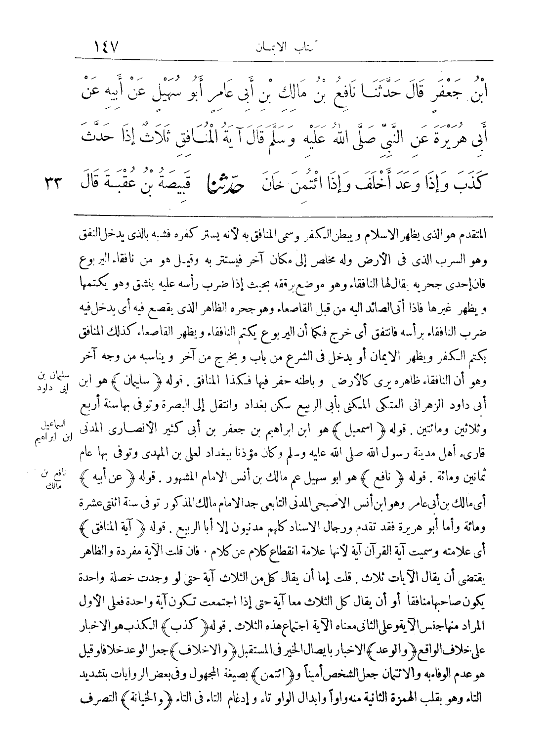 المتقدم هو الذي يظهر الإسلام ويبطن الكفر وسمى المنافق به لأنه يستر كفره فشبه بالذي يدخل النفق وهو السرب الذي في الأرض وله مخلص إلى مكان آخر فيستتر به وقيل هو من نافقاء اليربوع فإن إحدى جحريه يقال لها النافقاء وهو موضع يرققه بحيث إذا ضرب رأسه عليه ينشق وهو يكتمها ويظهر غيرها فإذا أتى الصائد إليه من قبل القاصعاء وهو جحره الظاهر الذي يقصع فيه أي يدخل فيه ضرب النافقاء برأسه فانتفق أي خرج فكما أن اليربوع يكتم النافقاء ويظهر القاصعاء كذلك المنافق يكتم الكفر ويظهر الإيمان أو يدخل في الشرع من باب ويخرج من آخر ويناسبه من وجه آخر وهو أن النافقاء ظاهره يرى كالأرض وباطنه حفر فيها فكذا المنافق. قوله: (سليمان) هو ابن أبي داود الزهراني العتكي المكني بأبي الربيع سكن بغداد وانتقل إلى البصرة وتوفي بها سنة أربع وثلاثين ومائتين. قوله: (إسمعيل) هو ابن إبراهيم بن جعفر بن أبي كثير الأنصاري المدني قارئ أهل مدينة رسول الله صلى الله عليه وسلم وكان مؤذناً ببغداد لعلي بن المهدي وتوفي بها عام ثمانين ومائة. قوله: (نافع) هو أبو سهيل عم مالك بن أنس الإمام المشهور. قوله: (عن أبيه) أي مالك بن أبي عامر وهو ابن أنس الأصبحي المدني التابعي جد الإمام مالك المذكور توفي سنة اثنتي عشرة ومائة وأما أبو هريرة فقد تقدم ورجال الإسناد كلهم مدنيون إلا أبا الربيع. قوله: (آية المنافق) أي علامته وسميت آية القرآن آية لأنها علامة انقطاع كلام عن كلام. فإن قلت الآية مفردة والظاهر يقتضي أن يقال الآيات ثلاث. قلت إما أن يقال كل من الثلاث آية حتى لو وجدت خصلة واحدة يكون صاحبها منافقاً أو أن يقال كل الثلاث معاً آية حتى إذا اجتمعت تكون آية واحدة فعلى الأول المراد منها جنس الآية وعلى الثاني معناه الآية اجتماع هذه الثلاث. قوله: (كذب) الكذب هو الإخبار على خلاف الواقع (والوعد) الإخبار بإيصال الخير في المستقبل (والإخلاف) جعل الوعد خلافاً وقيل هو عدم الوفاء به والائتمان جعل الشخص أميناً و (ائتمن) بصيغة المجهول وفي بعض الروايات بتشديد التاء وهو بقلب الهمزة الثانية منه واواً وإبدال الواو تاء وإدغام التاء في التاء (والخيانة) التصرف
