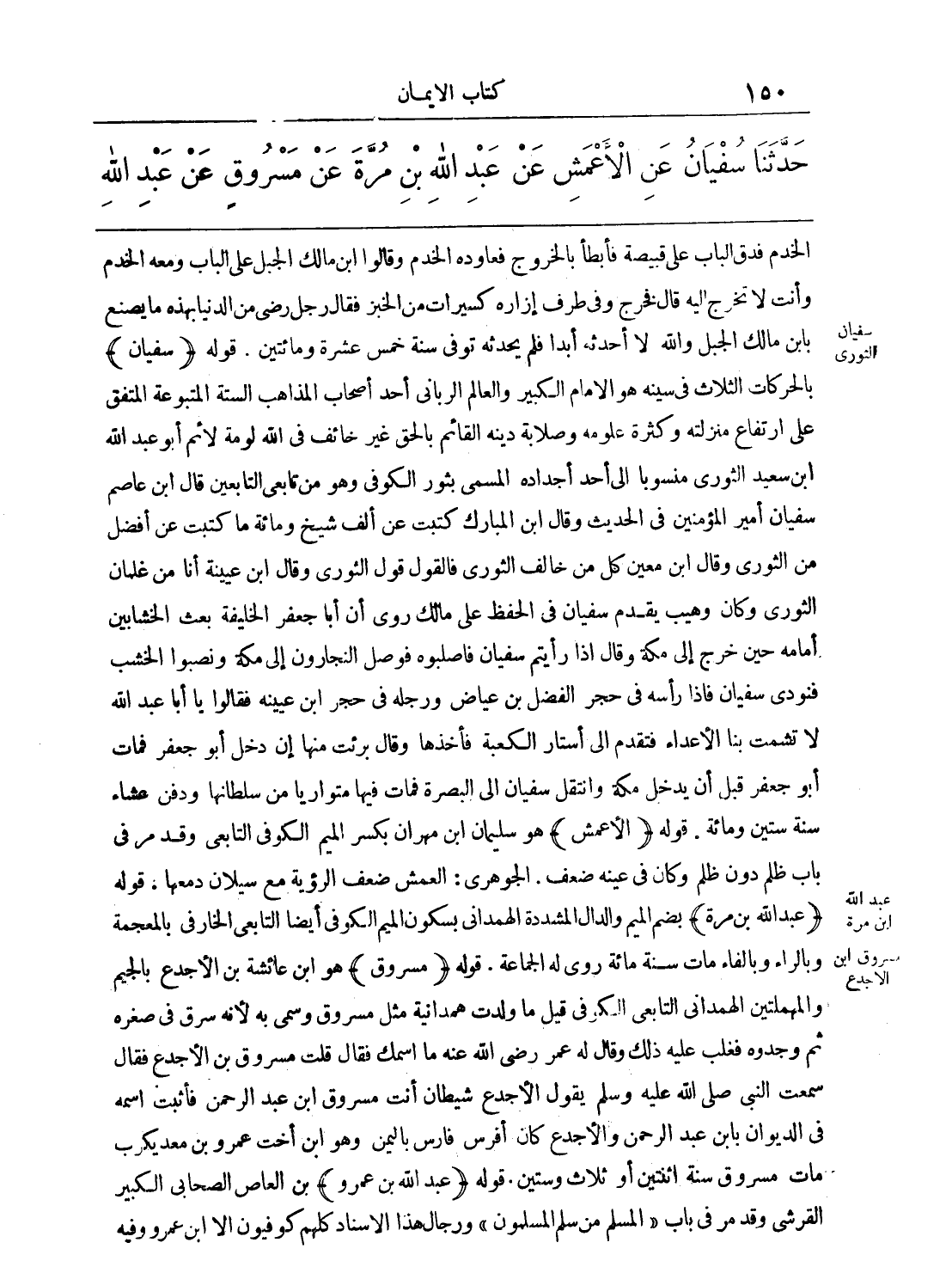 الخدم فدق الباب على قبيصة فأبطأ بالخروج فعاوده الخدم وقالوا ابن مالك الجبل على الباب ومعه الخدم وأنت لا تخرج إليه قال فخرج وفي طرف إزاره كسيرات من الخبز فقال رجل رضي من الدنيا بهذه ما يصنع بابن مالك الجبل والله لا أحدثه أبداً فلم يحدثه توفي سنة خمس عشرة ومائتين. قوله: (سفيان) بالحركات الثلاث في سينه هو الإمام الكبير والعالم الرباني أحد أصحاب المذاهب الستة المتبوعة المتفق على ارتفاع منزلته وكثرة علومه وصلابة دينه القائم بالحق غير خائف في الله لومة لائم أبو عبد الله ابن سعيد الثوري منسوباً إلى أحد أجداده المسمى بثور الكوفي وهو من تابعي التابعين قال ابن عاصم سفيان أمير المؤمنين في الحديث وقال ابن المبارك كتبت عن ألف شيخ ومائة ما كتبت عن أفضل من الثوري وقال ابن معين كل من خالف الثوري فالقول قول الثوري وقال ابن عيينة أنا من غلمان الثوري وكان وهيب يقدم سفيان في الحفظ على مالك روى أن أبا جعفر الخليفة بعث الخشابين أمامه حين خرج إلى مكة وقال إذا رأيتم سفيان فاصلبوه فوصل النجارون إلى مكة ونصبوا الخشب فنودي سفيان فإذا رأسه في حجر الفضل بن عياض ورجله في حجر ابن عيينة فقالوا يا أبا عبد الله لا تشمت بنا الأعداء فتقدم إلى أستار الكعبة فأخذها وقال برئت منها إن دخل أبو جعفر فمات أبو جعفر قبل أن يدخل مكة وانتقل سفيان إلى البصرة فمات فيها متوارياً من سلطانها ودفن عشاء سنة ستين ومائة. قوله: (الأعمش) هو سليمان ابن مهران بكسر الميم الكوفي التابعي وقد مر في باب ظلم دون ظلم وكان في عينه ضعف. الجوهري: العمش ضعف الرؤية مع سيلان دمعها. قوله: (عبد الله بن مرة) بضم الميم والدال المشددة الهمداني بسكون الميم الكوفي أيضاً التابعي الخارفي بالمعجمة وبالراء وبالفاء مات سنة مائة روى له الجماعة. قوله: (مسروق) هو ابن عائشة بن الأجدع بالجيم والمهملتين الهمداني التابعي الكوفي قيل ما ولدت همدانية مثل مسروق وسمي به لأنه سرق في صغره ثم وجدوه فغلب عليه ذلك وقال له عمر رضي الله عنه ما اسمك فقال قلت مسروق بن الأجدع فقال سمعت النبي صلى الله عليه وسلم يقول الأجدع شيطان أنت مسروق ابن عبد الرحمن فأثبت اسمه في الديوان بابن عبد الرحمن والأجدع كان أفرس فارس باليمن وهو ابن أخت عمرو بن معد يكرب مات مسروق سنة اثنتين أو ثلاث وستين. قوله: (عبد الله بن عمرو) بن العاص الصحابي الكبير القرشي وقد مر في باب (المسلم من سلم المسلمون) ورجال هذا الإسناد كلهم كوفيون إلا ابن عمرو وفيه
