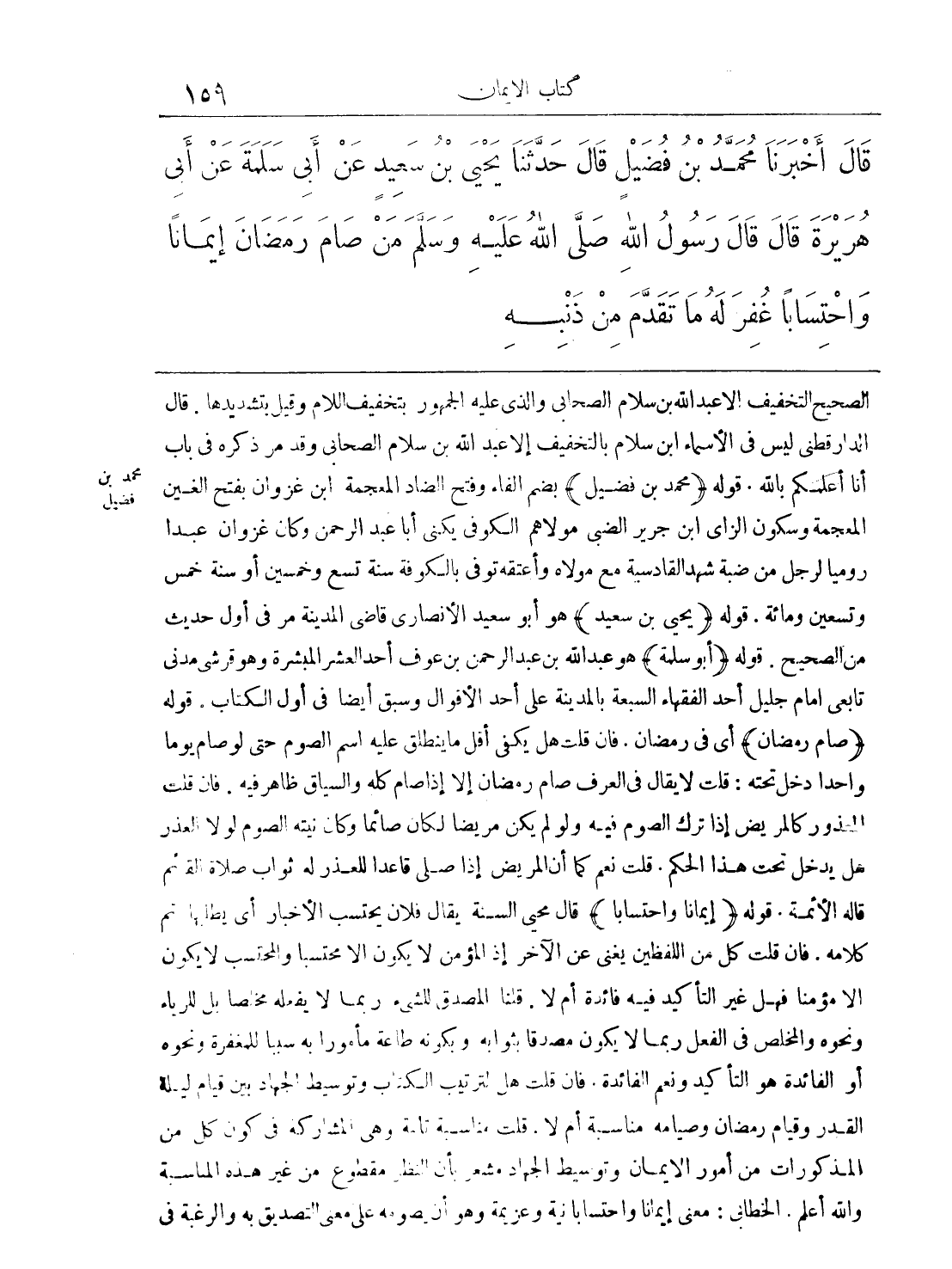 الصحيح التخفيف إلا عبد الله بن سلام الصحابي والذي عليه الجمهور بتخفيف اللام وقيل بتشديدها. قال الدارقطني ليس في الأسماء ابن سلام بالتخفيف إلا عبد الله بن سلام الصحابي وقد مر ذكره في باب أنا أعلمكم بالله. قوله: (محمد بن فضيل) بضم الفاء وفتح الضاد المعجمة ابن غزوان بفتح الغين المعجمة وسكون الزاي ابن جرير الضبي مولاهم الكوفي يكني أبا عبد الرحمن وكان غزوان عبداً رومياً لرجل من ضبة شهد القادسية مع مولاه وأعتقه توفي بالكوفة سنة تسع وخمسين أو سنة خمس وتسعين ومائة. قوله: (يحيى بن سعيد) هو أبو سعيد الأنصاري قاضي المدينة مر في أول حديث من الصحيح. قوله: (أبو سلمة) هو عبد الله بن عبد الرحمن بن عوف أحد العشر المبشرة وهو قرشي مدني تابعي إمام جليل أحد الفقهاء السبعة بالمدينة على أحد الأقوال وسبق أيضاً في أول الكتاب. قوله: (صام رمضان) أي في رمضان. فإن قلت هل يكفي أقل ما ينطلق عليه اسم الصوم حتى لو صام يوماً واحداً دخل تحته: قلت لا يقال في العرف صام رمضان إلا إذا صام كله والسياق ظاهر فيه. فإن قلت المعذور كالمريض إذا ترك الصوم فيه ولو لم يكن مريضاً لكان صائماً وكان نيته الصوم لولا العذر هل يدخل تحت هذا الحكم. قلت نعم كما أن المريض إذا صلى قاعداً للعذر له ثواب صلاة القائم قاله الأئمة. قوله: (إيماناً واحتساباً) قال محيي السنة يقال فلان يحتسب الأخبار أي يطلبها ثم كلامه. فإن قلت كل من اللفظين يغني عن الآخر إذ المؤمن لا يكون إلا محتسباً والمحتسب لا يكون إلا مؤمناً فهل غير التأكيد فيه فائدة أم لا. قلنا المصدق للشيء ربما لا يفعله مخلصاً بل للرياء ونحوه والمخلص في الفعل ربما لا يكون مصدقاً بثوابه وبكونه طاعة مأموراً به سبباً للمغفرة ونحوه أو الفائدة هو التأكيد ونعم الفائدة. فإن قلت هل لترتيب الكتاب وتوسيط الجهاد بين قيام ليلة القدر وقيام رمضان وصيامه مناسبة أم لا. قلت مناسبة تامة وهي المشاركة في كون كل من المذكورات من أمور الإيمان وتوسيط الجهاد مشعر بأن النظر مقطوع من غير هذه المناسبة والله أعلم. الخطابي: معنى إيماناً واحتساباً نية وعزيمة وهو أن يصومه على معنى التصديق به والرغبة في