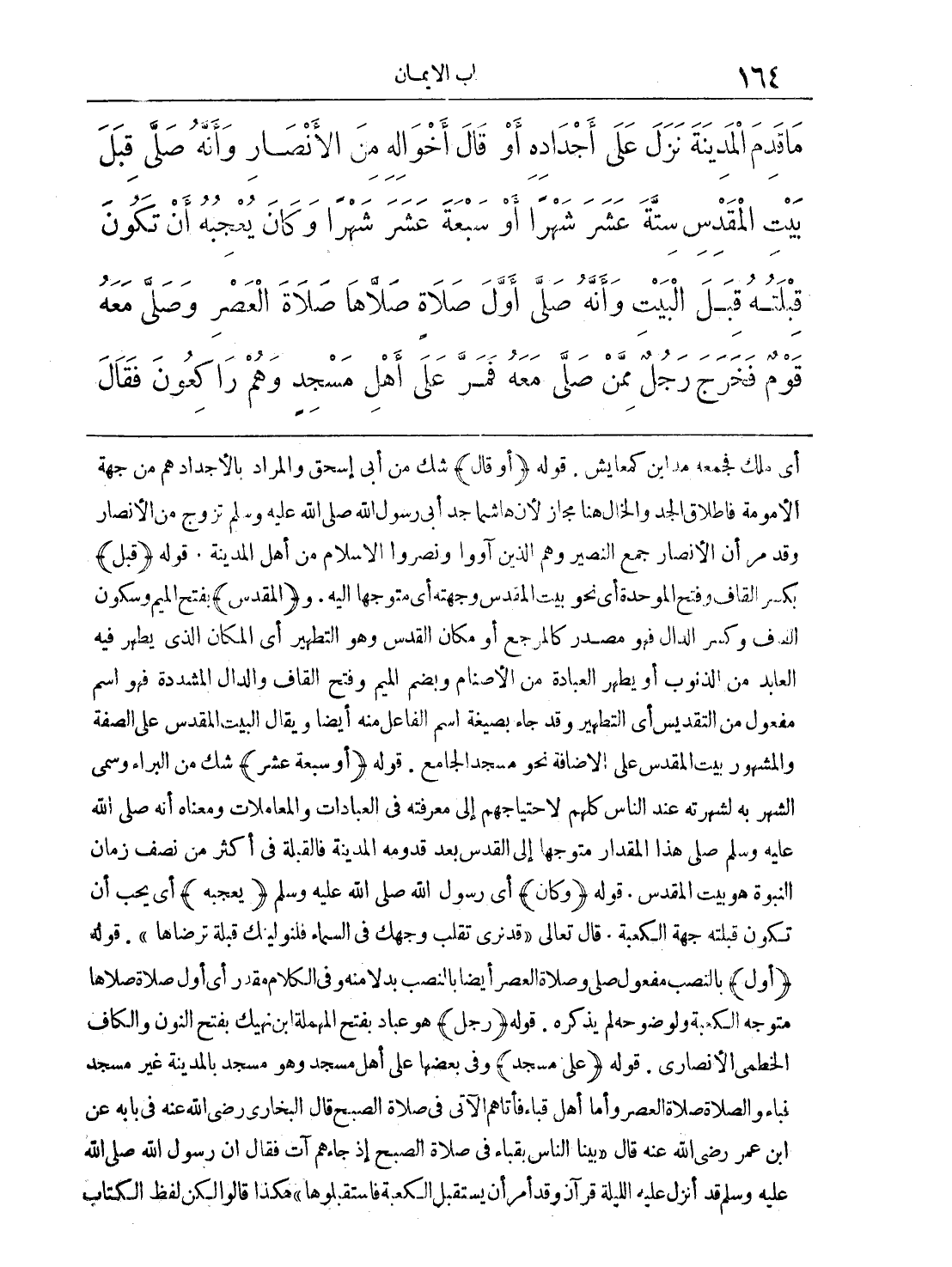 أي ملك فجمعه مداين كمعايش. قوله: (أو قال) شك من أبي إسحق والمراد بالأجداد هم من جهة الأمومة فإطلاق الجد والخال هنا مجاز لأن هاشماً جد أبي رسول الله صلى الله عليه وسلم تزوج من الأنصار وقد مر أن الأنصار جمع النصير وهم الذين آووا ونصروا الإسلام من أهل المدينة. قوله: (قبل) بكسر القاف وفتح الموحدة أي نحو بيت المقدس وجهته أي متوجهاً إليه. و (المقدس) بفتح الميم وسكون القاف وكسر الدال فهو مصدر كالمرجع أو مكان المقدس وهو التطهير أي المكان الذي يطهر فيه العابد من الذنوب أو يطهر العبادة من الأصنام وبضم الميم وفتح القاف والدال المشددة فهو اسم مفعول من التقديس أي التطهير وقد جاء بصيغة اسم الفاعل منه أيضاً ويقال البيت المقدس على الصفة والمشهور بيت المقدس على الإضافة نحو مسجد الجامع. قوله: (أو سبعة عشر) شك من البراء وسمي الشهر به لشهرته عند الناس كلهم لاحتياجهم إلى معرفته في العبادات والمعاملات ومعناه أنه صلى الله عليه وسلم صلى هذا المقدار متوجهاً إلى القدس بعد قدومه المدينة فالقبلة في أكثر من نصف زمان النبوة هو بيت المقدس. قوله: (وكان) أي رسول الله صلى الله عليه وسلم (يعجبه) أي يحب أن تكون قبلته جهة الكعبة. قال تعالى (قد نرى تقلب وجهك في السماء فلنولينك قبلة ترضاها). قوله:: (أول) بالنصب مفعول صلى وصلاة العصر أيضاً بالنصب بدلاً منه وفي الكلام مقدر أي أول صلاة صلاها متوجه الكعبة ولوضوحه لم يذكره. قوله: (رجل) هو عباد بفتح المهملة بن نهيك بفتح النون والكاف الخطمي الأنصاري. قوله: (على مسجد) وفي بعضها على أهل مسجد وهو مسجد بالمدينة غير مسجد قباء والصلاة صلاة العصر وأما أهل قباء فأتاهم الآتي في صلاة الصبح قال البخاري رضي الله عنه في بابه عن ابن عمر رضي الله عنه قال (بينا الناس بقباء في صلاة الصبح إذ جاءهم آت فقال أن رسول الله صلى الله عليه وسلم قد أنزل عليه الليلة قرآن وقد أمر أن يستقبل الكعبة فاستقبلوها) هكذا قالوا الكن لفظ الكتاب
