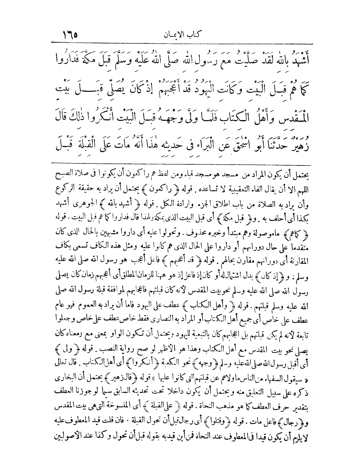 يحتمل أن يكون المراد من مسجد هو مسجد قباء ومن لفظ هم راكعون أن يكونوا في صلاة الصبح اللهم إلا أن يقال الفاء التعقيبية لا تساعده. قوله: (راكعون) يحتمل أن يراد به حقيقة الركوع وأن يراد به الصلاة من باب إطلاق الجزء وإرادة الكل. قوله: (أشهد بالله) الجوهري أشهد بكذا أي أحلف به. و (قبل مكة) أي قبل البيت الذي بمكة ولهذا قال فداروا كما هم قبل البيت. قوله: (كماهم) ما موصولة وهم مبتدأ وخبره محذوف. وتحولوا عليه أي داروا مشبهين بالحال الذي كان متقدماً على حال دورانهم أو داروا على الحال الذي هم كانوا عليه ومثل هذه الكاف تسمى بكاف المقارنة أي دورانهم مقارن بحالهم. قوله: (قد أعجبهم) فاعل أعجب هو رسول الله صلى الله عليه وسلم. و (إذ كان) بدل اشتمال له أو كان إذ فاعل إذ هو ههنا للزمان المطلق أي أعجبهم زمان كان يصلي رسول الله صلى الله عليه وسلم نحو بيت المقدس لأنه كان قبلتهم فإعجابهم لموافقة قبلة رسول الله صلى الله عليه وسلم قبلتهم. قوله: (وأهل الكتاب) عطف على اليهود فأما أن يراد به العموم فهو عام عطف على خاص أي جميع أهل الكتاب أو المراد به النصارى فقط خاص عطف على خاص وجعلوا تابعة لأنه لم يكن قبلتهم بل إعجابهم كان بالتبعية لليهود ويحتمل أن تكون الواو بمعنى مع ومعناه كان يصلي نحو بيت المقدس مع أهل الكتاب وهذا هو الأظهر لو صح رواية النصب. قوله: (ولى) أي أقبل رسول الله صلى الله عليه وسلم (وجهه) نحو الكعبة (أنكروا) أي أهل الكتاب. قال تعالى (سيقول السفهاء من الناس ما ولاهم عن قبلتهم التي كانوا عليها) قوله: (قال زهير) يحتمل أن البخاري ذكره على سبيل التعليق منه ويحتمل أن يكون داخلاً تحت تحديثه السابق سيما لو جوزنا العطف بتقدير حرف العطف كما هو مذهب النحاة. قوله: (على القبلة) أي المنسوخة التي هي بيت المقدس و (رجال) فاعل مات. قوله: (وقتلوا) أي رجال قبل أن تحول القبلة. فإن قلت قيد المعطوف عليه لا يلزم أن يكون قيداً في المعطوف عند النحاة فمن أيد قيد به بقوله: قبل أن تحول وكذا عند الأصوليين