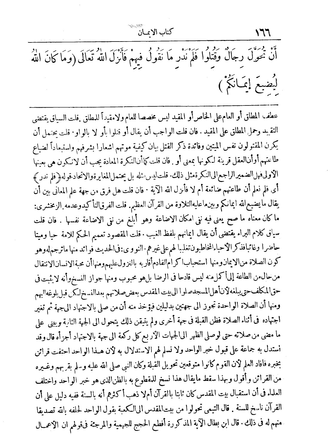 عطف المطلق أو العام على الخاص أو المقيد ليس مخصصاً للعام ولا مقيداً للمطلق. قلت السياق يقتضي التقييد وحمل المطلق على المقيد. فإن قلت الواجب أن يقال أو قتلوا بأو لا بالواو. قلت يحتمل أن يكون المقتولون نفس الميتين وفائدة ذكر القتل بيان كيفية موتهم إشعاراً بشرفهم واستبعاداً لضياع طاعتهم أو أن العقل قرينة لكونها بمعنى أو. فإن قلت كما أن النكرة المعادة يجب أن لا تكون هي بعينها الأولى فهل الضمير الراجع إلى النكرة مثل ذلك. قلت ليس مثله بل يحتمل المغايرة والاتحاد. قوله: (فلم ندر) أي فلم نعلم أن طاعتهم ضائعة أم لا فأنزل الله الآية. فإن قلت هل فرق من جهة علم المعاني بين أن يقال ما يضيع الله إيمانكم وبين ما عليه التلاوة من القرآن العظيم. قلت الفرق التأكيد وعدمه. الزمخشري: ما كان معناه ما صح يعني فيه نفي إمكان الإضاعة وهو أبلغ من نفي الإضاعة نفسها. فإن قلت سياق كلام البراء يقتضي أن يقال إيمانهم بلفظ الغيب. قلت المقصود تعميم الحكم للأمة حياً وميتاً حاضراً وغائباً فذكر الأحياء المخاطبون تغليباً لهم على غيرهم. النووي: في الحديث فوائد منها ما ترجم له وهو كون الصلاة من الإيمان ومنها استحباب إكرام القادم أقاربه بالنزول عليهم ومنها أن محبة الإنسان الانتقال من حال من الطاعة إلى أكمل منه ليس قادحاً في الرضا بل هو محبوب ومنها جواز النسخ وأنه لا يثبت في حق المكلف حتى يبلغه لأن أهل المسجد صلوا إلى بيت المقدس بعض صلاتهم بعد النسخ لكن قبل بلوغه إليهم ومنها أن الصلاة الواحدة تجوز إلى جهتين بدليلين فيؤخذ منه أن من صلى بالاجتهاد إلى جهة ثم تغير اجتهاده في أثناء الصلاة فظن القبلة في جهة أخرى ولم يتيقن ذلك يتحول إلى الجهة الثانية ويبنى على ما مضى من صلاته حتى لو صلى الظهر إلى الجهات الأربع كل ركعة إلى جهة بالاجتهاد أجزأه قال وقد استدل به جماعة على قبول خبر الواحد ولا نسلم لهم الاستدلال به لأن هذا الواحد احتفت قرائن بخبره فأفاد العلم لأن القوم كانوا متوقعين تحويل القبلة وكان النبي صلى الله عليه وسلم بقربهم وغيره من القرائن وأقول وبهذا سقط ما يقال هذا نسخ للمقطوع به بالظن الذي هو خبر الواحد واختلف العلماء في أن استقبال بيت المقدس كان ثابتاً بالقرآن أم لا ذهب أكثرهم أنه بالسنة ففيه دليل على أن القرآن ناسخ للسنة. قال التيمي تحولوا من بيت المقدس إلى الكعبة بقول الواحد لحلفه بالله تصديقاً منهم له في ذلك. قال ابن بطال الآية المذكورة أقطع الحجج للجهمية والمرجئة في قولهم أن الأعمال