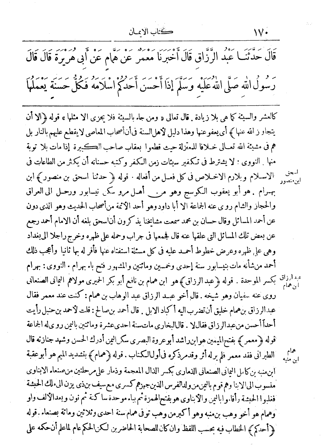 كالعشر والسيئة كما هي بلا زيادة. قال تعالى (ومن جاء بالسيئة فلا يجزى إلا مثلها) قوله: (إلا أن يتجاوز الله عنها) أي يعفو عنها وهذا دليل لأهل السنة في أن أصحاب المعاصي لا يقطع عليهم بالنار بل هم في مشيئة الله تعالى خلافاً للمعتزلة حيث قطعوا بعقاب صاحب الكبيرة إذا مات بلا توبة منها. النووي: لا يشترط في تكفير سيئات زمن الكفر وكتبه حسناته أن يكثر من الطاعات في الإسلام ويلازم الإخلاص في كل فعل من أفعاله. قوله: (حدثنا إسحق بن منصور) ابن بهرام. هو أبو يعقوب الكوسج وهو من أهل مرو سكن نيسابور ورحل إلى العراق والحجاز والشام روى عنه الجماعة إلا أبا داود وهو أحد الأئمة من أصحاب الحديث وهو الذي دون عن أحمد المسائل وقال حسان بن محمد سمعت مشايخنا يذكرون أن إسحق بلغه أن الإمام أحمد رجع عن بعض تلك المسائل التي علقها عنه قال فجمعها في جراب وحمله على ظهره وخرج راجلاً إلى بغداد وهي على ظهره وعرض خطوط أحمد عليه في كل مسألة استفتاه عنها فأقر له بها ثانياً وأعجب ذلك أحمد من شأنه مات بنيسابور سنة إحدى وخمسين ومائتين والمشهور فتح باء بهرام. النووي: بهرام بكسر الموحدة. قوله: (عبد الرزاق) هو ابن همام بن نافع أبو بكر الحميري مولاهم اليماني الصنعاني روى عنه سفيان وهو شيخه. قال أخو عبد الرزاق عبد الوهاب بن همام: كنت عند معمر فقال عبد الرزاق بن همام خليق أن تضرب إليه أكباد الإبل. قال أحمد بن صالح: قلت لأحمد بن حنبل رأيت أحداً أحسن من عبد الرزاق فقال لا. قال البخاري مات سنة إحدى عشرة مائتين باليمن روى له الجماعة قوله: (معمر) بفتح الميمين هو ابن راشد أبو عروة البصري سكن اليمن أدرك الحسن وشهد جنازته قال الطبراني فقد معمر فلم ير له أثر وقد مر ذكره في أول الكتاب. قوله: (همام) بتشديد الميم هو أبو عقبة ابن منبه بن كامل اليماني الصنعاني الذماري بكسر الذال المعجمة وذمار على مرحلتين من صنعاء الأبناوي منسوب إلى الأبنا وهم قوم باليمن من ولد الفرس الذين جهزهم كسرى مع سيف بن ذي يزن إلى ملك الحبشة فغلبوا الحبشة وأفاءوا باليمن والأبناوي هو بفتح الهمزة ثم بباء موحدة ساكنة ثم نون وبعد الألف واو وهمام هو أخو وهب بن منبه وهو أكبر من وهب توفي همام سنة إحدى وثلاثين ومائة بصنعاء. قوله: (أحدكم) الخطاب فيه بحسب اللفظ وإن كان للصحابة الحاضرين لكن الحكم عام لما علم أن حكمه على