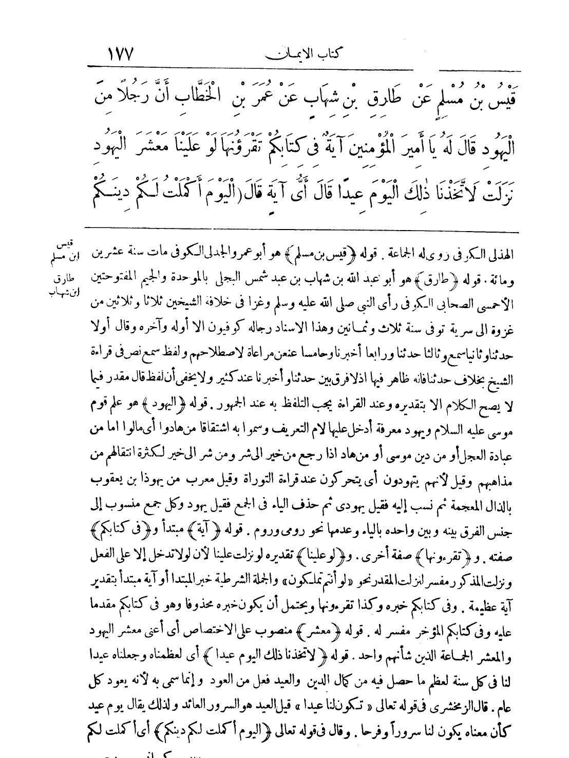 قَيْسُ بْنُ مُسْلِمٍ عَنْ طَارِقِ بْنِ شِهَابٍ عَنْ عُمَرَ بْنِ الْخَطَّابِ أَنَّ رَجُلاً مِنَ الْيَهُودِ قَالَ لَهُ يَا أَمِيرَ الْمُؤْمِنِينَ، آيَةٌ فِى كِتَابِكُمْ تَقْرَءُونَهَا لَوْ عَلَيْنَا مَعْشَرَ الْيَهُودِ نَزَلَتْ لاَتَّخَذْنَا ذَلِكَ الْيَوْمَ عِيداً. قَالَ أَىُّ آيَةٍ قَالَ (الْيَوْمَ أَكْمَلْتُ لَكُمْ دِينَكُمْ