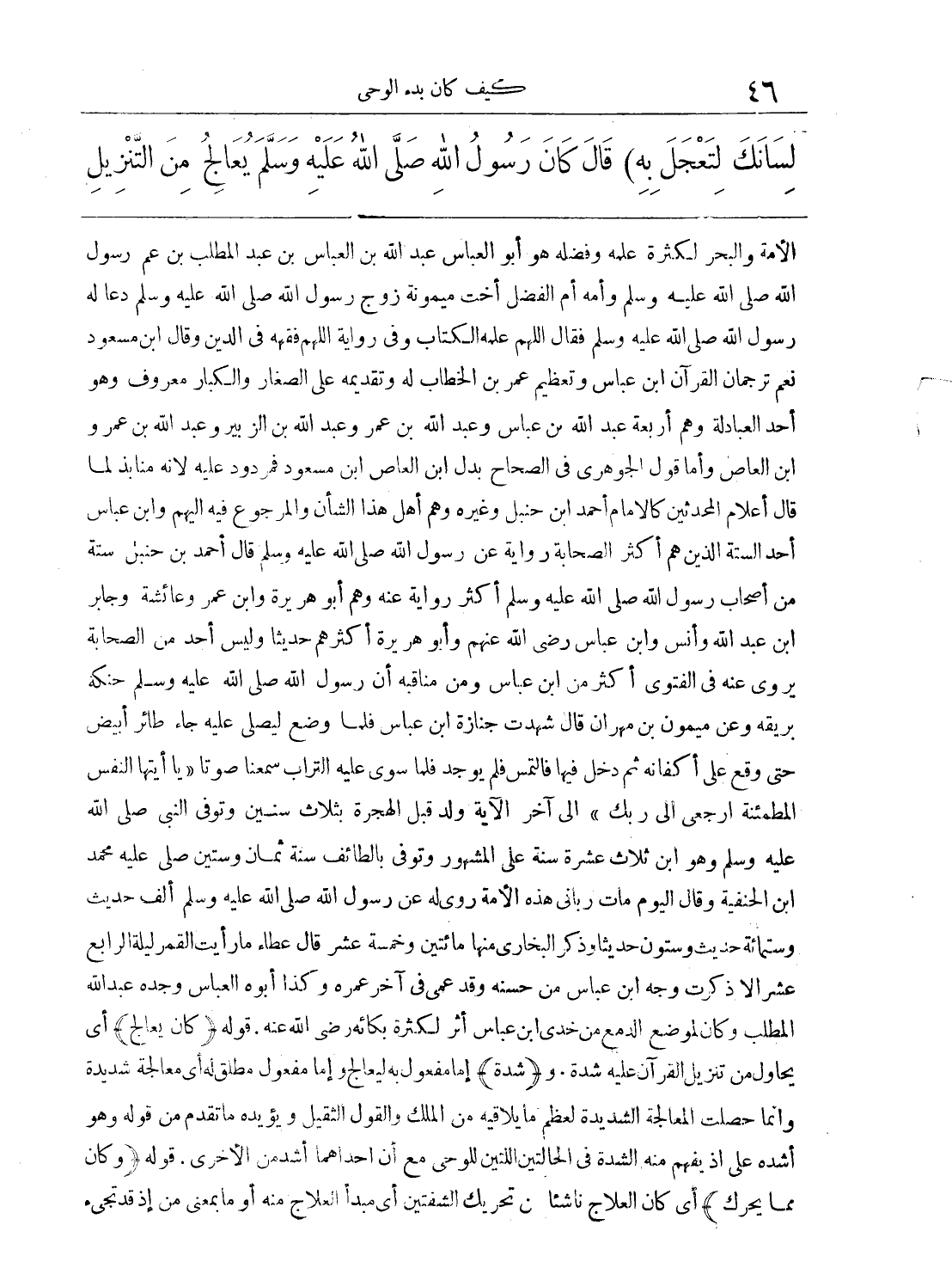 الأمة والبحر لكثرة علمه وفضله هو أبو العباس عبد الله بن العباس بن عبد المطلب بن عم رسول الله صلى الله عليه وسلم وأمه أم الفضل أخت ميمونة زوج رسول الله صلى الله عليه وسلم دعا له رسول الله صلى الله عليه وسلم فقال اللهم علمه الكتاب وفي رواية اللهم فقهه في الدين وقال ابن مسعود نعم ترجمان القرآن ابن عباس وتعظيم عمر بن الخطاب له وتقديمه على الصغار والكبار معروف وهو أحد العبادلة وهم أربعة عبد الله بن عباس وعبد الله بن عمر وعبد الله بن الزبير وعبد الله بن عمر وابن العاص وأما قول الجوهري في الصحاح ... بدل ابن العاص ابن مسعود فمردود عليه لأنه منابذ لما قال أعلام المحدّثين كالإمام أحمد ابن حنبل وغيره وهم أهل هذا الشأن والمرجوع فيه إليهم وابن عباس أحد الستة الذين هم أكثر الصحابة رواية عن رسول الله صلى الله عليه وسلم قال أحمد بن حنبل ستة من أصحاب رسول الله صلى الله عليه وسلّم أكثر رواية عنه وهم أبو هريرة وابن عمر وعائشة وجابر ابن عبد الله وأنس وابن عباس رضي الله عنهم وأبو هريرة أكثرهم حديثا وليس أحد من الصحابة يروي عنه في الفتوى أكثر من ابن عباس ومن مناقبه أن رسول الله صلى الله عليه وسلم حنكه بريقه وعن مميمون بن مهران قال شهدت جنازة ابن عباس فلما وضع ليصلى عليه جاء طائر أبيض حتى وقع على أكفانه ثم دخل فالتمس فلم يوجد فلما سوي عليه التراب سمعنا صوتا ((يا أيتها النفس المطمئنة ارجعي إلى ربّك)) إلى آخر الآية ولد قبل الهجرة بثلاث سنين وتوفي النبيّ صلى الله عليه وسلم وهو ابن ثلاث عشرة سنة على المشهور وتوفي بالطائف سنة ثمان وستين صلى عليه محمد ابن الحنفية وقال اليوم مات ربّاني هذه الأمة روى له عن رسول الله صلى الله عليه وسلم ألف حديث وستمائة حديث وستون حديثا ذكر البخاري منها مائتين وخمسة عشر قال عطاء ما رأيت القمر ليلة الرابع عشر إلا ذكرت وجه ابن عباس من حسنه وقد عمي في أواخر عمره وكذا أبوه العباس وجده عبد الله المطلب وكان لموضع الدمع من خدي ابن عباس أثر لكثرة بكائه رضي الله عنه. قوله: (كان يعالج) إما مفعول به ليعالج وإما مفعول مطلق أي معالجة شديدة وإنما حصلت المعالجة الشديدة لعظم ما يلاقيه من الملك والقول الثقيل ويؤيده ما تقدم من قوله: وهو أشدّه على إذ يفهم منه الشدّة في الحالتين اللتين للوحي مع أن أحداهما أشد من الأخرى. قوله: (وكان مما يحرك) أي كان العلاج منه أو بمعنى من إذ قد تجيء