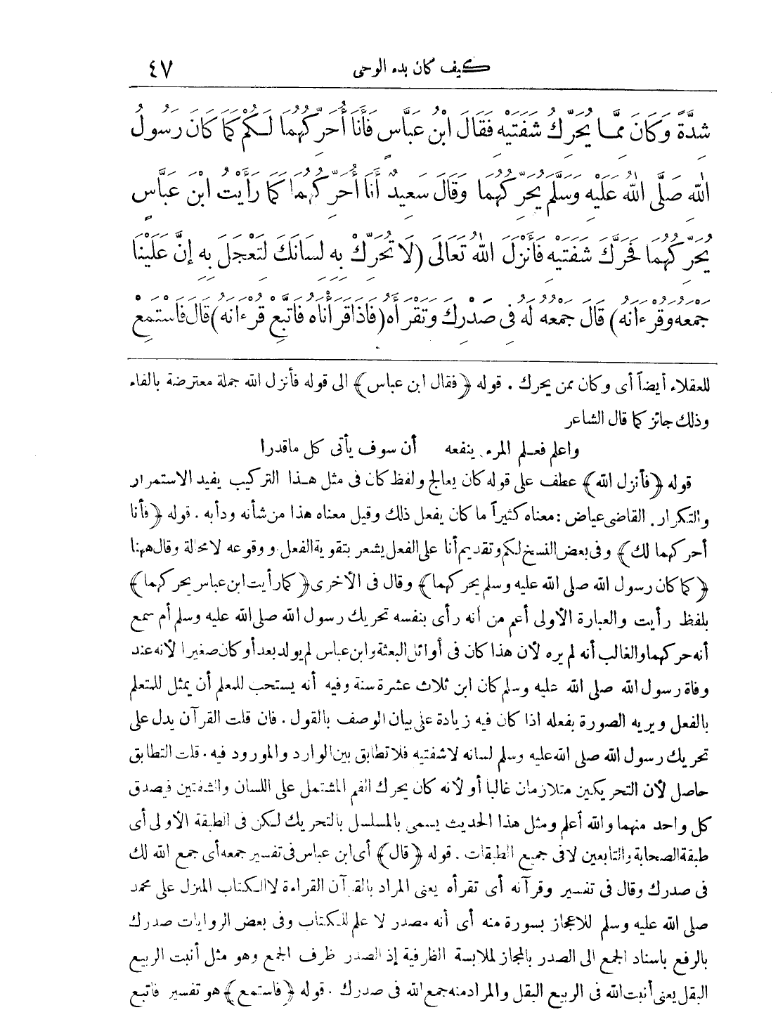 قوله: (فأنزل الله) عطف على قوله: كان يعالج ولفظ كان في مثل هذا التركيب يفيد الاستمرار والتكرار. القاضي عياض: معناه كثيرا ما كان يفعل ذلك وقيل معناه هذا من شأنه ودأبه. قوله: (فأنا أحركهما لك) وفي بعض النسخ لكم وتقديم أنا على الفعل يشعر بتقوية الفعل ووقوعه لا محالة وقال ههنا (كما كان رسول الله صلى الله عليه وسلم يحركهما) وقال في الأخرى (كما رأيت ابن عباس يحركهما) بلفظ رأيت والعبارة العبارة الأولى أعم من أنه رأى بنفسه تحريك رسول الله صلى الله عليه وسلّم كان ابن ثلاث عشرة سنة وفيه أنه يستحب للمعلم أن يمثل للمتعلم بالفعل ويريد الصورة بفعله إذا كان فيه زيادة على بيان الوصف بالقول. قلت القرآن يدل على تحريك رسول الله صلى الله عليه وسلم لسانه لا شفتيه فلا تطابق بين الوارد والمورود فيه. قلت التطابق حصل لأن التحريكين متلازمان غالبا أو لأنه كان يحرك الفم المشتمل على اللسان والشفتين فيصدق كل واحد منهما والله أعلم ومثل هذا الحديث يسمى بالمسلسل بالتحريك لكن في الطبقة الأولى أي طبقة الصحابة والتابعين لا في جميع الطبقات. قوله: (قال) أي ابن عباس في تفسير جمعه أي جمع الله لك في صدرك وقال في تفسير وقرآنه أي تقرأه يعني المراد بالقرآن القراءة لا الكتاب المنزل على محمد صلى الله عليه وسلم للاعجاز بسورة منه أي أنه مصدر لا علم للكتاب وفي بعض الروايات صدرك بالرفع باسناد الجمع إلى الصدر بالمجاز لملابسة الظرفية إذ الصدر ظرف الجمع وهو مثل أنبت الربيع البقل يعني أنبت الله في الربيع البقل والمراد منه جمع الله في صدرك. قوله: (فاستمع) هو تفسير فاتبع
