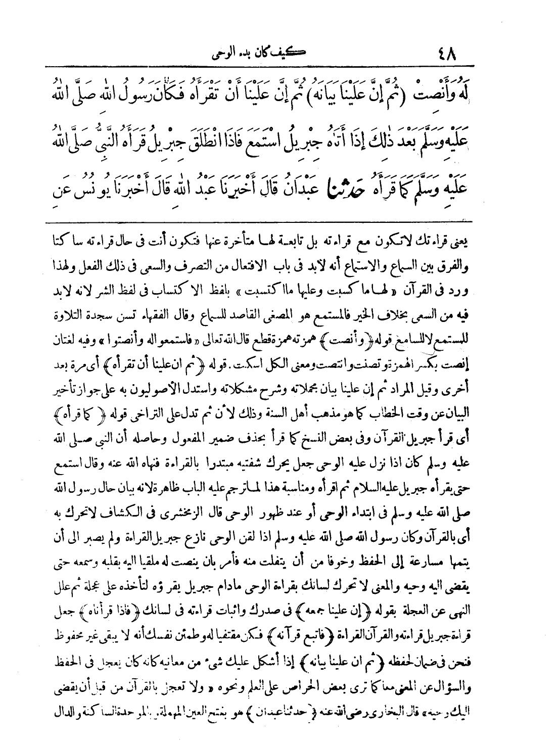 يعني قراءتك لا تكون مع قراءته بل تابعة لها متأخرة عنها فتكون أنت في حال قراءته ساكتا والفرق بين السماع والاستماع أنه لا بد في باب الافتعال من التصرف والسعي في ذلك الفعل ولهذا ورد في القرآن ((لها ماكسبت وعليها مااكتسبت)) بلفظ الاكتساب في لفظ الشر لأنه لا بد فيه من السعي بخلاف الخير فالمستمع هو المصغي القاصد للسماع وقال الفقهاء تسن سجدة التلاوة للمستمع لا للسامع قوله: (وأنصت) همزته همزة قطع قال الله تعالى ((فاستعمعوا له وأنصتوا)) وفيه لغتان إنصت بكسر الهمزة وتصنت وانصت ومعنى الكل اسكت. قوله: ((ثم إن علينا أن تقرأه)) أي مرة بعد أخرى وقيل المراد ثم إن علينا بيان مجملاته وشرح مشكلاته واستدل الأصوليون به على جواز تأخير البيان عن وقت الخطاب كما هو مذهب أهل السنة وذلك لأن ثم تدل على التراخي قوله: (كما قرأه) أي جبريل عليه السلام ثم أقرأه ومناسبة هذا لما ترجم عليه الباب ظاهرة لأنه بيان حال رسول الله صلى الله عليه وسلم في ابتداء الوحي أو عند ظهور الوحي قال الزمخشري في الكشاف لا تحرك به أي بالقرآن وكان رسول الله صلى الله عليه وسلم إذا لقن الوحي نازع جبريل القراءة ولم يصبر إلى أن يتمها مسارعة إلى الحفظ وخوفا من أن يتفلت منه فأمر بأن ينصت له ملقيا إليه بقلبه وسمعه حتى يقضي إليه وحيه والمعنى لا تحرك لسانك بقراءة الوحي مادام جبريل يقرأه لتأخذه على عجلة ثم علل النهي عن العجلة بقوله: (إنا علينا جمعه)) في صدرك واثبات قراءته في لسانك (فإذا قرأناه) جعل قراءة جبريل قراءته والقرآن القراءة (فاتبع قرآنه) فكن مقتفيا له وطمئن نفسك انه لا يبقى غير محفوظ فنحن في ضمان لحفظه (ثم إن علينا بيانه) إذا أشكل عليك شيء من معانيه كأنه كان يعجل في الحفظ والسؤال عن المعنى معا كما ترى بعض الحراص على العلم ونحو ((ولاتعجل بالقرآن من قبل أن يقضى إليك وحيه)) قال البخاري رضي الله عنه (حدثنا عبدان) هو بفتح العين المهملة بالموحدة الساكنة والدال